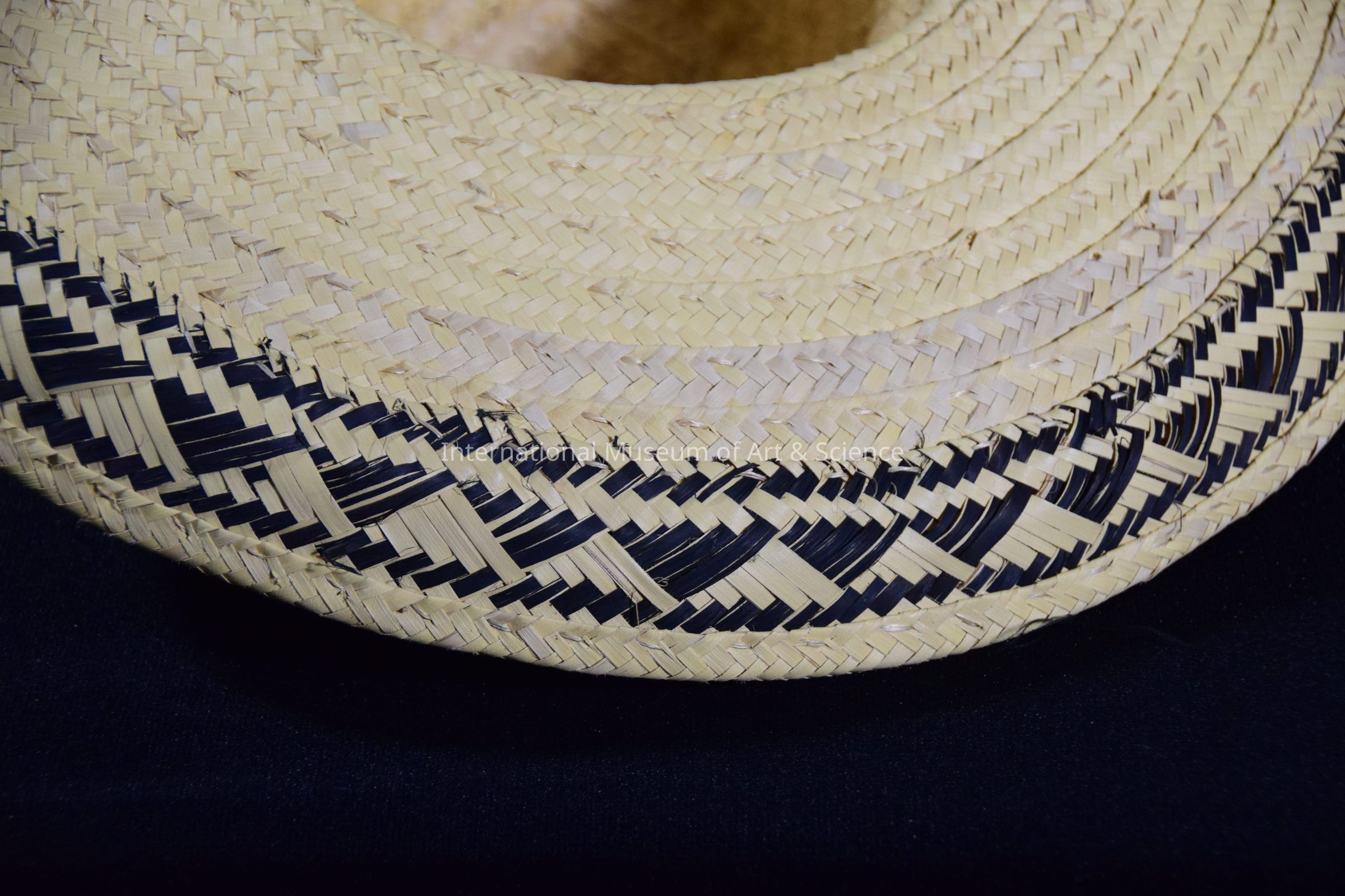 Hat w/high-domed crown of natural palm leaves; black on crown; black rayon ribbons on neck; large round brim.Artwork Details