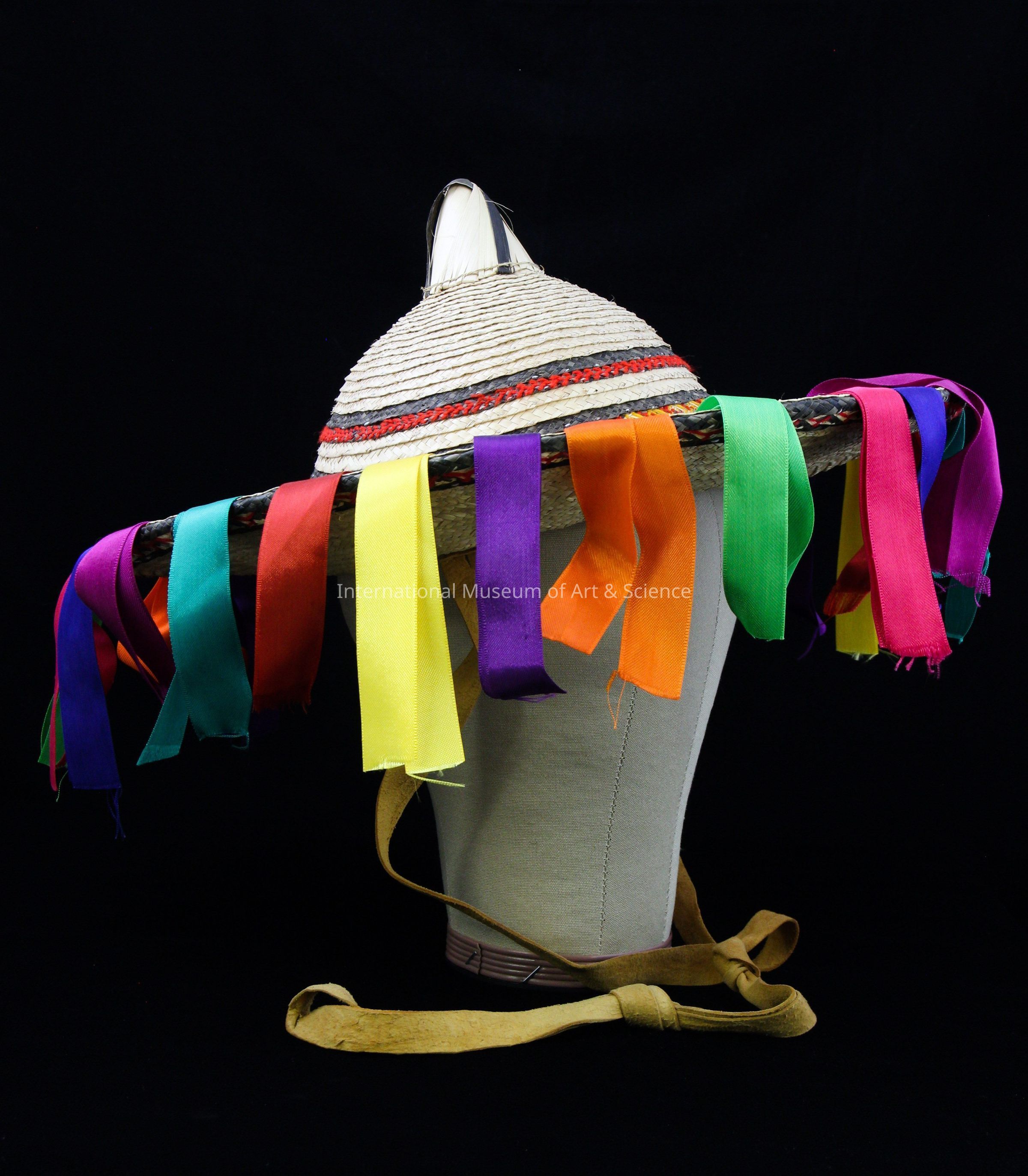 Hat. Cone-shaped tip wrapped of natural palm leaves; dome-shaped crown; black and natural palm leaf bands with red and yellow yarns interwoven; neck w/multicolored ribbons.Artwork Details