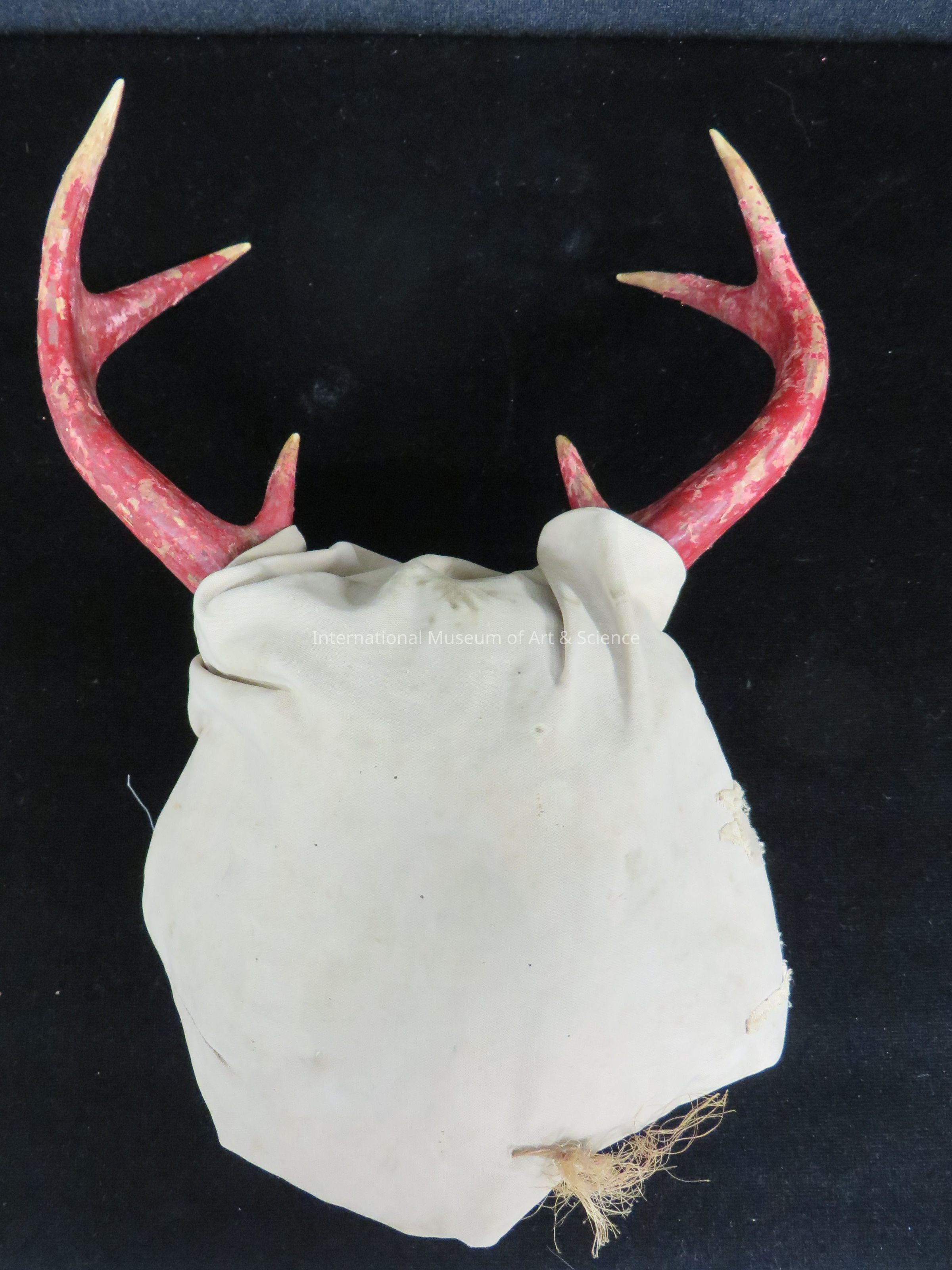 Headdress. Headdress used in Venado Dance; red antlers attached to fabric stuffed with palm leaves.Artwork Details