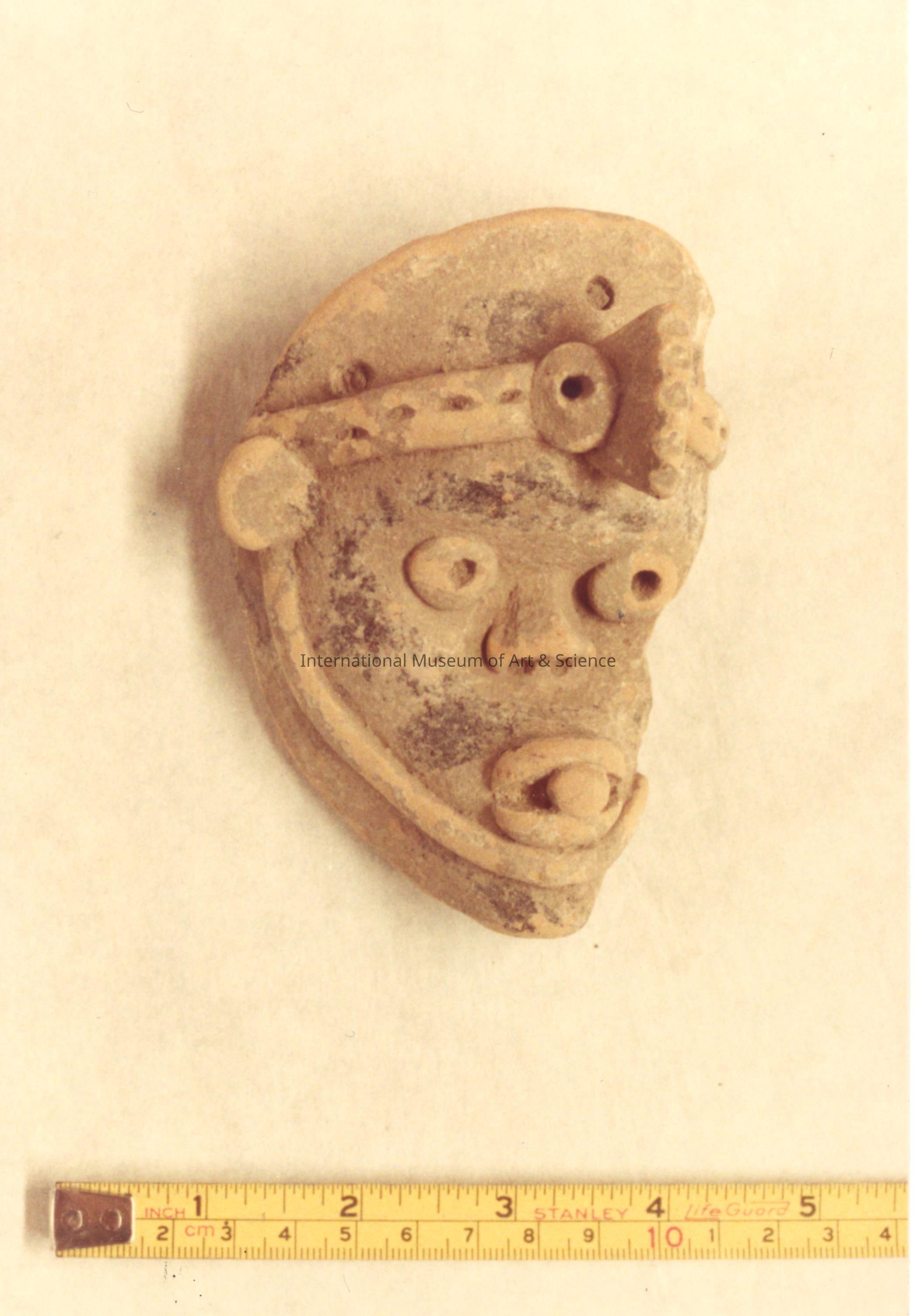 Head. Veracruz, Mexico. Huastec Indian. Clay. Pre-Columbian. Concave face at center; Death bubble (?) between his lips; wearing a head band w/ central avial ornament and chin strap; circular eyes; repouse forehead and chin.