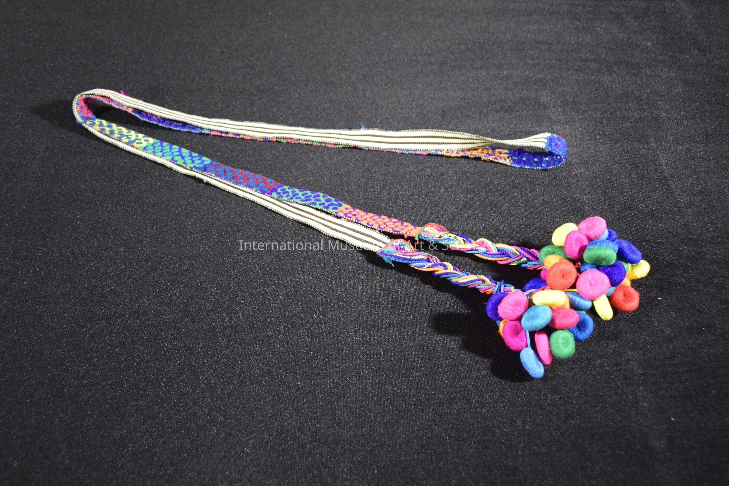 A woven headband. One end of the headband strap has black and white striped. The other side is woven with colorful patterns. The ends of the band are braids withmulti-colored button-shaped pendants at ends.Artwork Details