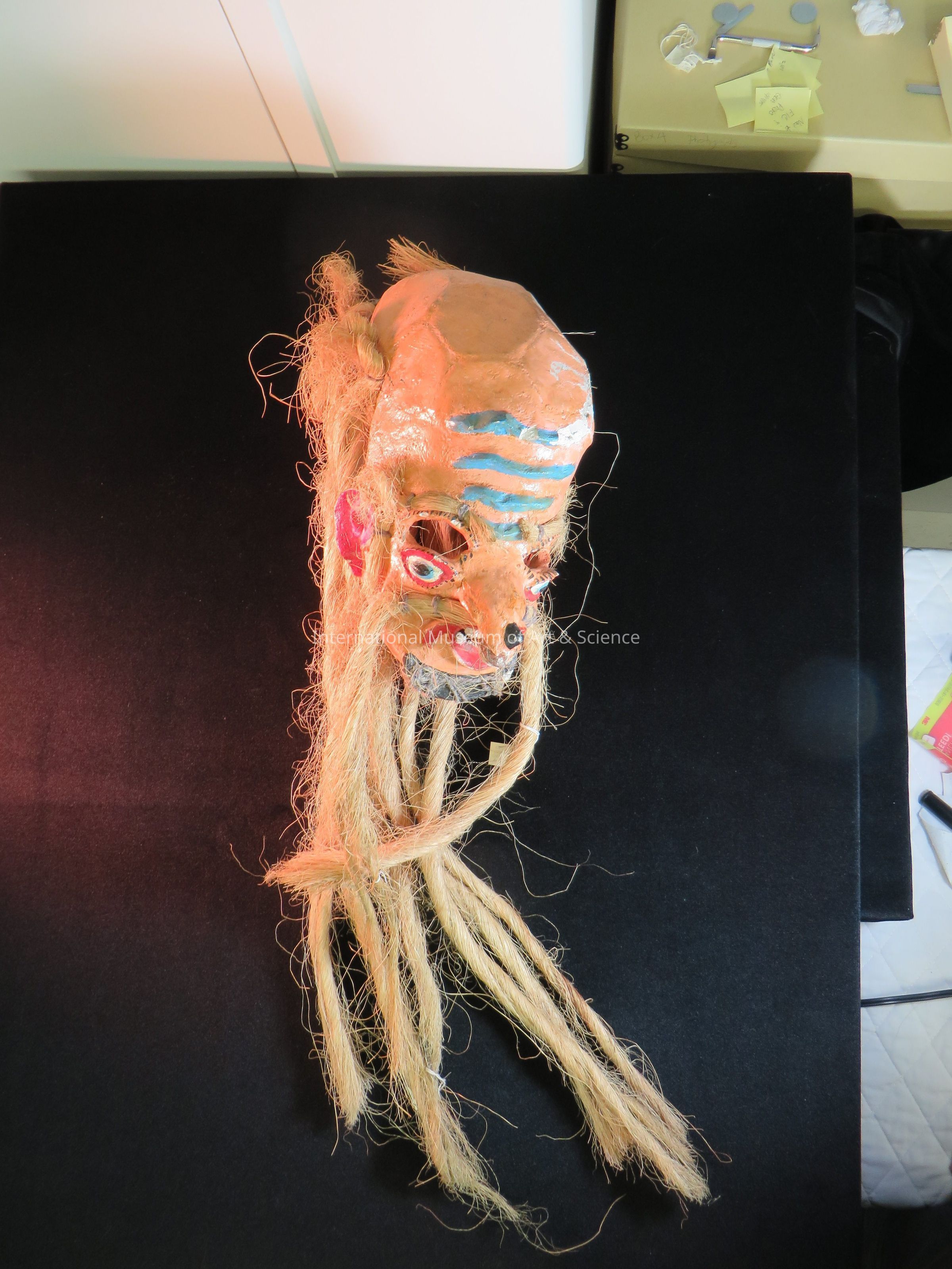 Hermit Mask. Hermint mask crown soccer ball(?) leather painted peach skin color; bald-head with blue forehead wrinkles; curved downward nose; red ears, attached as moustache, eyebrows and hair.Artwork Details