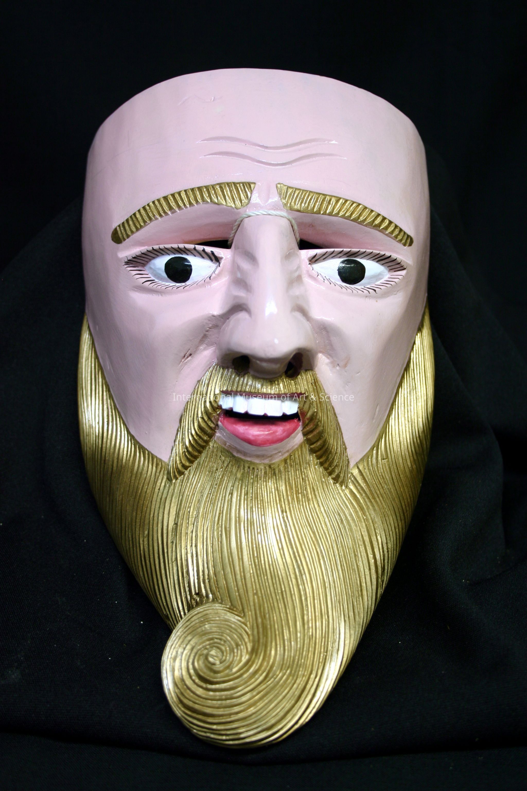 A Hermitano mask. It has finely carved features. The man's face is elaborately painted, with linear eyebrows, moustache and curled beard painted gold. The face is bright pink, black and white oval eyes, a red mouth open, white carved teeth, a protruded nose, and curvilinear lines on forehead. There are eyes for the wearer to see through.Artwork Details