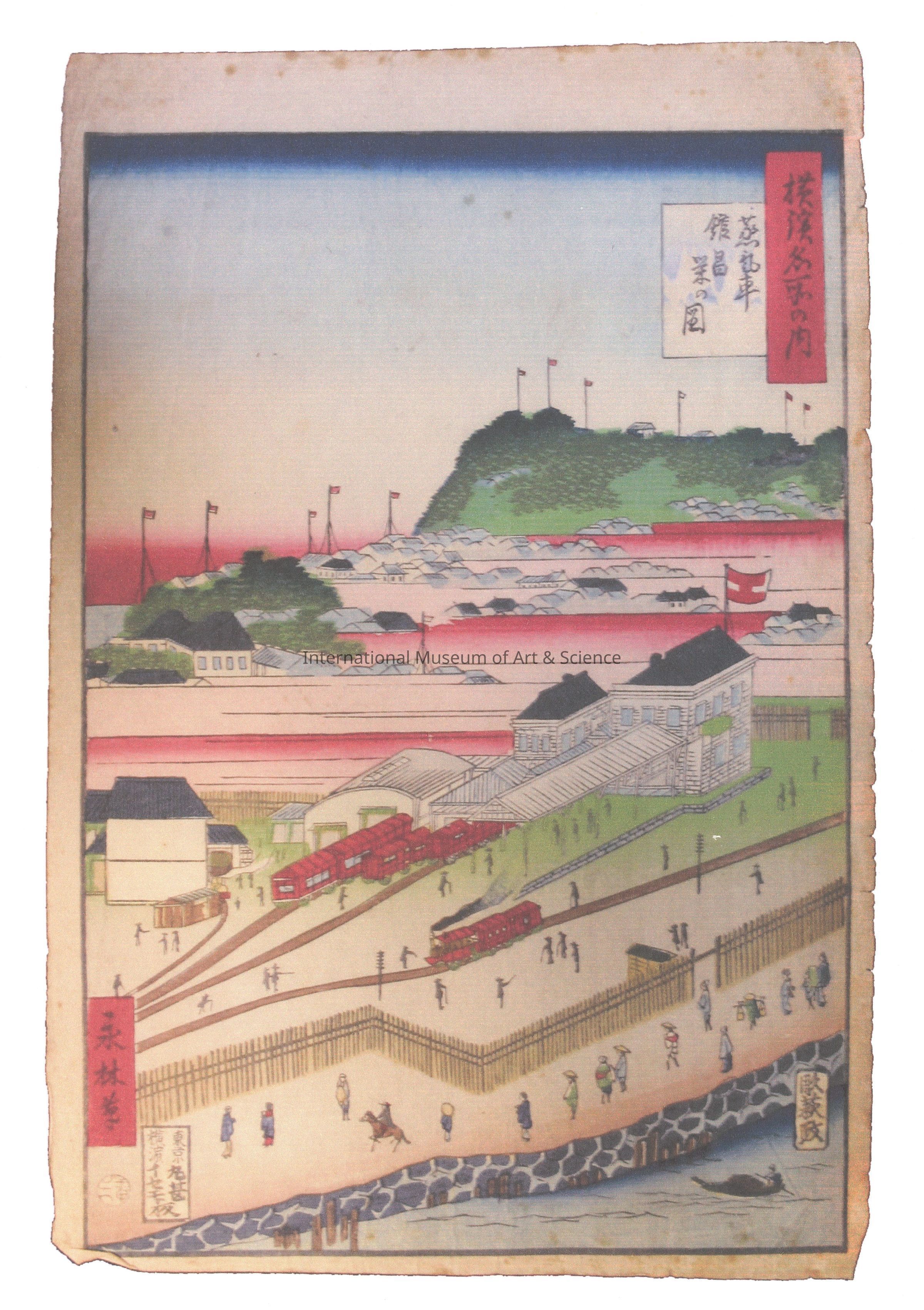 A woodblock print. The scene shows a A railroad station along the Tokyo and Yokohama rail line. This print was published by Marujin, Tokyo & Yokohama. It is part of the Yokohama Famous Places series.Dimensions