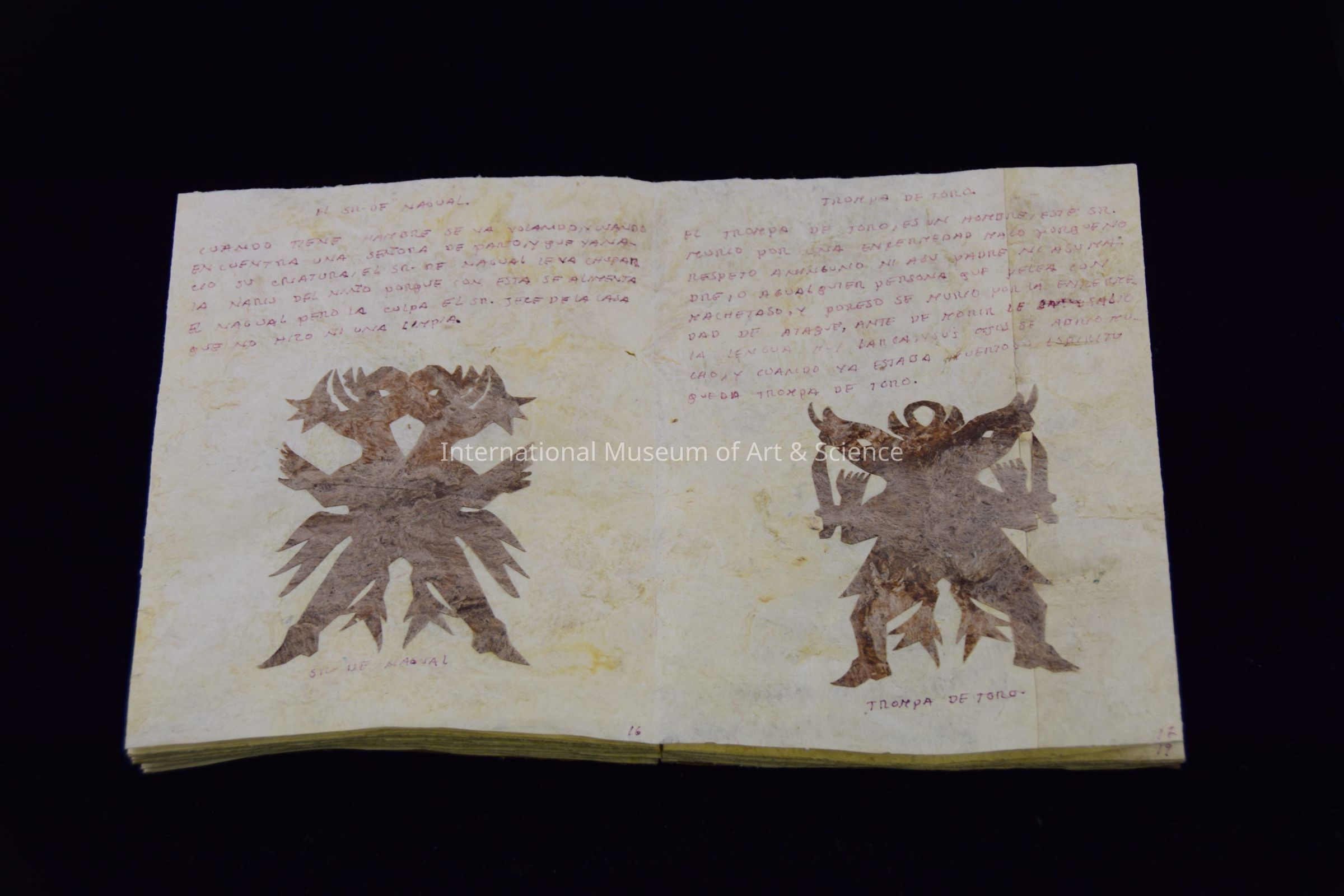 A book made from amatl paper. The book was created in August 1978. It has 28 white amatl pages with dark brown amatl figures, idols, and animals attached. The words within are handwritten in red ink.Made/Created