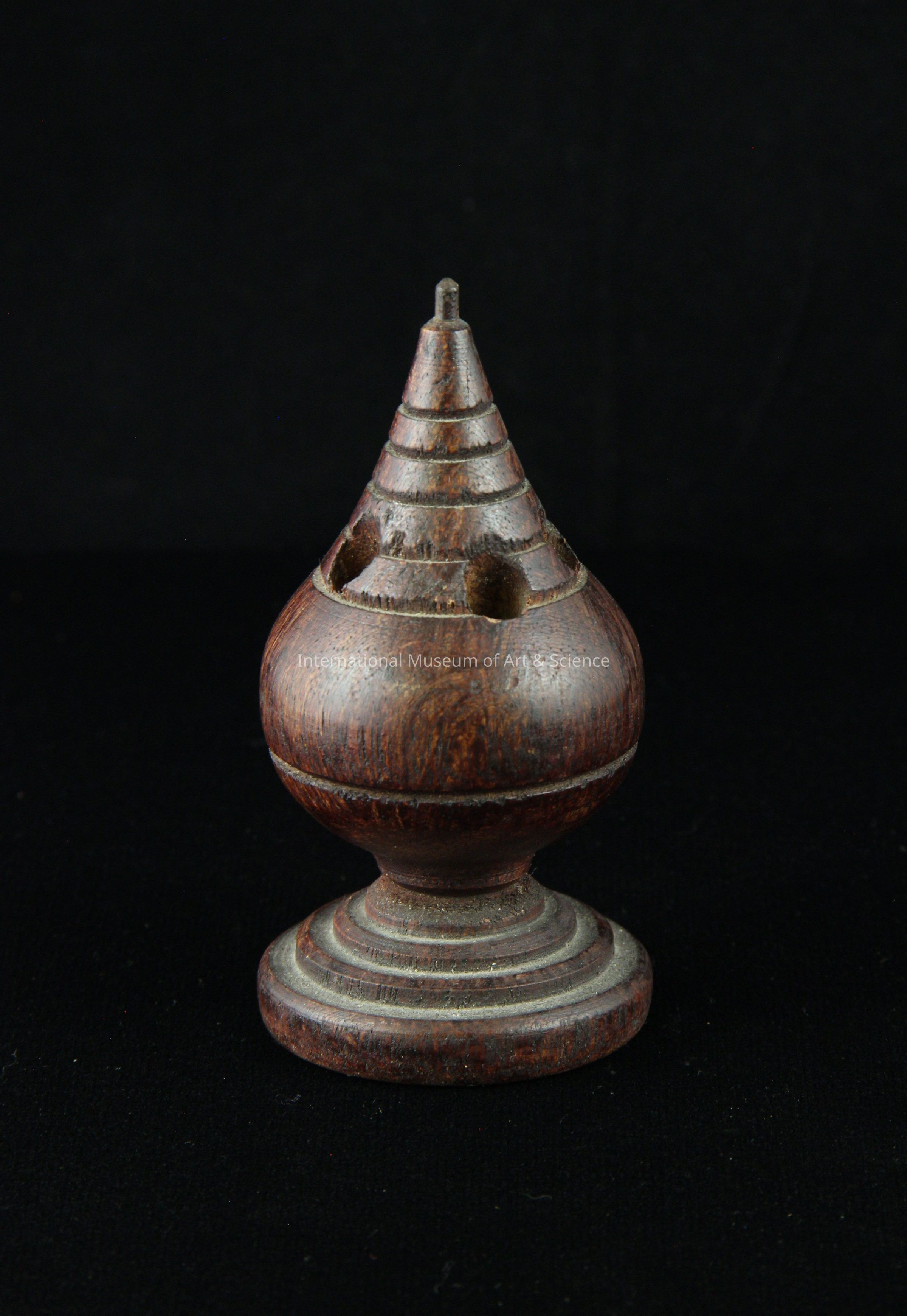 A wooden pencil holder. The pencil holder is carved into a top like shape. There are four holes in the top section, spaced irregularly. There are also five grooves cut around the top portion. There is one groove cut around the center and three grooves cut around the base. The piece is stained a dark brown.Dimensions