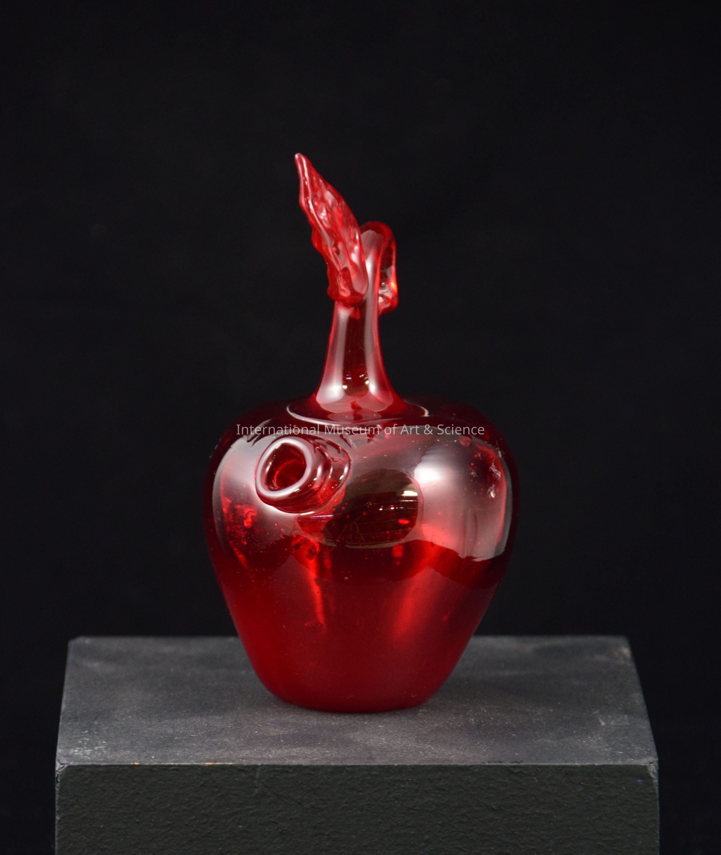 Apple pencil holder of red glass. There is a single leaf at the top of a curled stem. There is a small hole on one side for pen or pencils. The spherical body is shaped like an apple.Made/Created