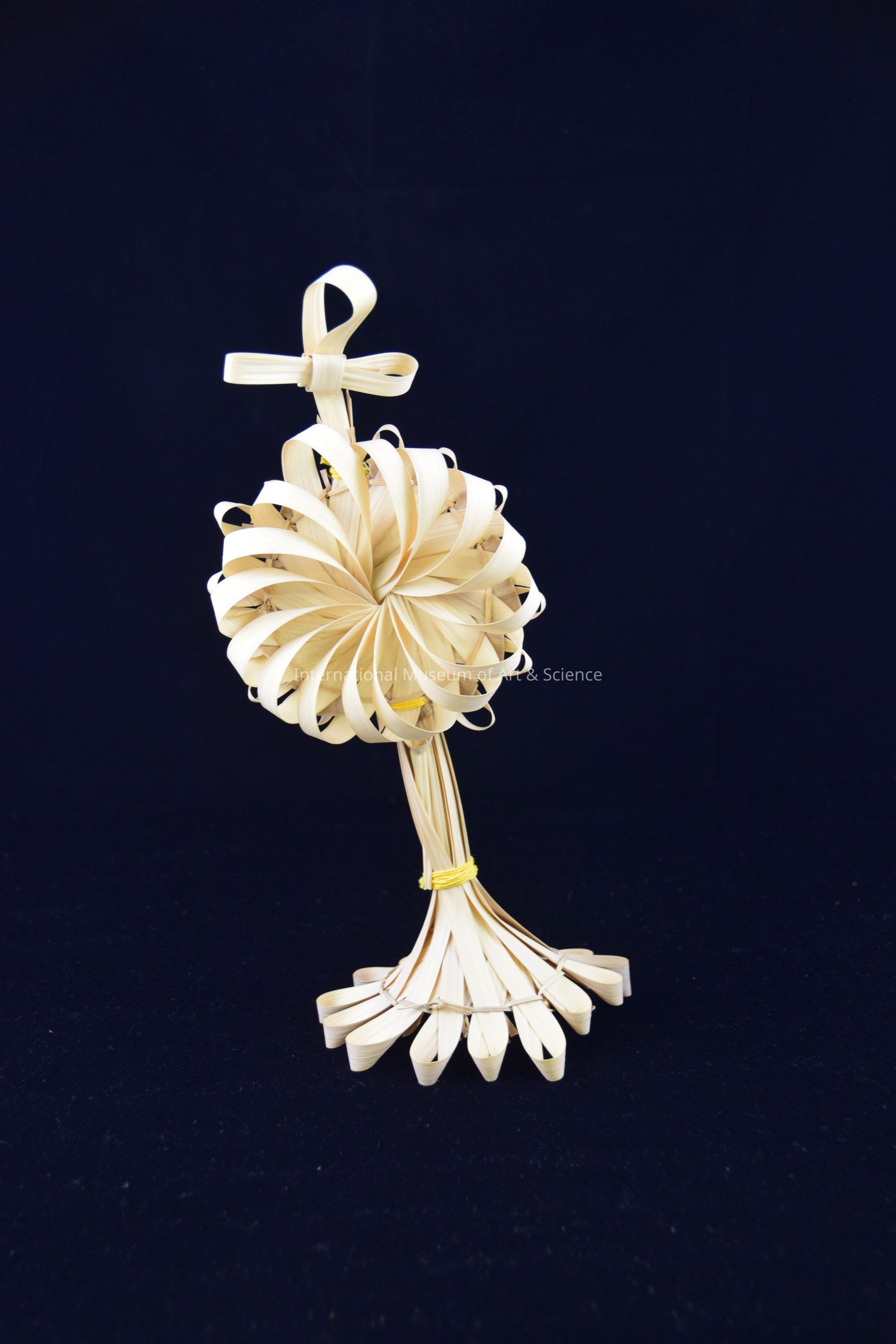 A Holy Week Ornament. A standing ornament made of natural cream colored palm leaves. it has a small cross on top, with a large circular pin-wheeled at center, and the baseis in a floral loop form. The strips are tied with yellow yarn.Made/Created