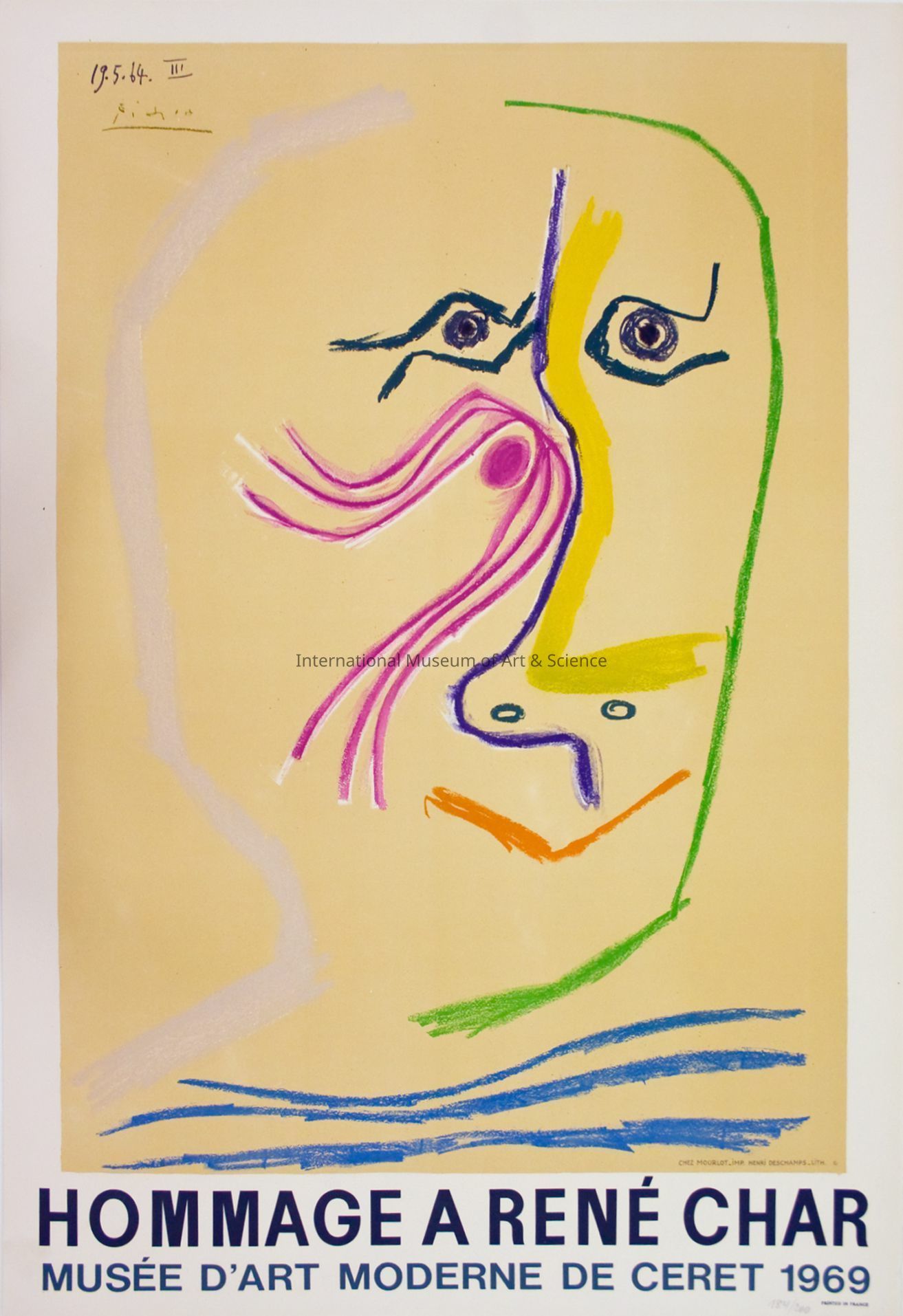 "Homage a Rene Char Musee d'Art Moderne de Cevet 1969". Frontal, abstract face in varying colors; gray and green strokes represent head, neck, and shoulder; purple stroke forms nose and dark green spots show eyes and nostrils; orange area forms mouth; nose is bordered by yellow on right and pink on left; three blue strokes, border face horizontally at bottom; title at bottom "Homage a Rene Char Musee d'Art Moderne de Cevet 1969".Dimensions