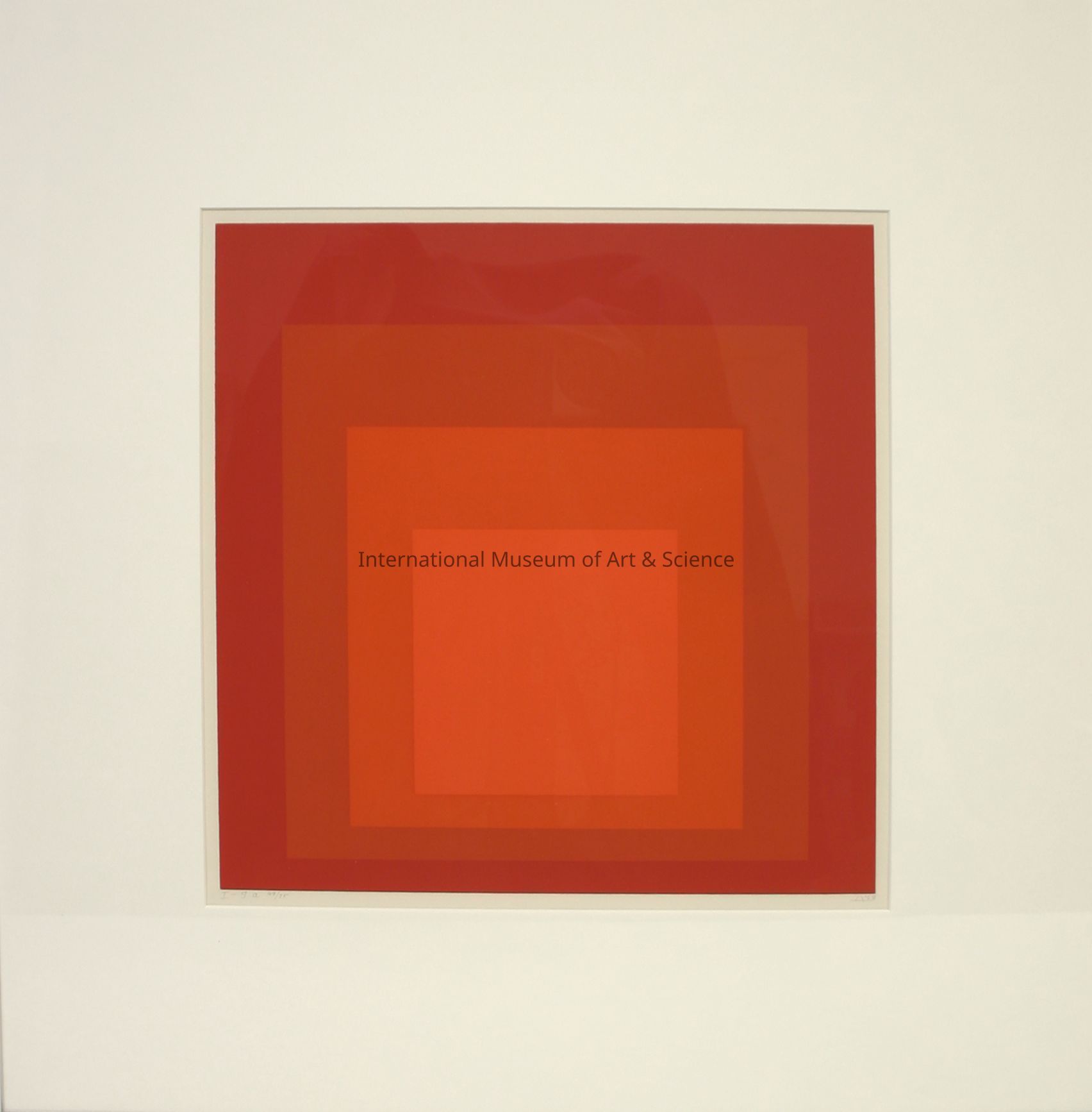 "Homage to the Square". Josef Albers. American. c. 1965-1968. 49/75; silkscreen in degrees of medium to dark orange; composition off-center concentric squares; smallest interior square of lightest orange, with second and third layers increasing in darkness with exterior square layer darkest in red-orange.