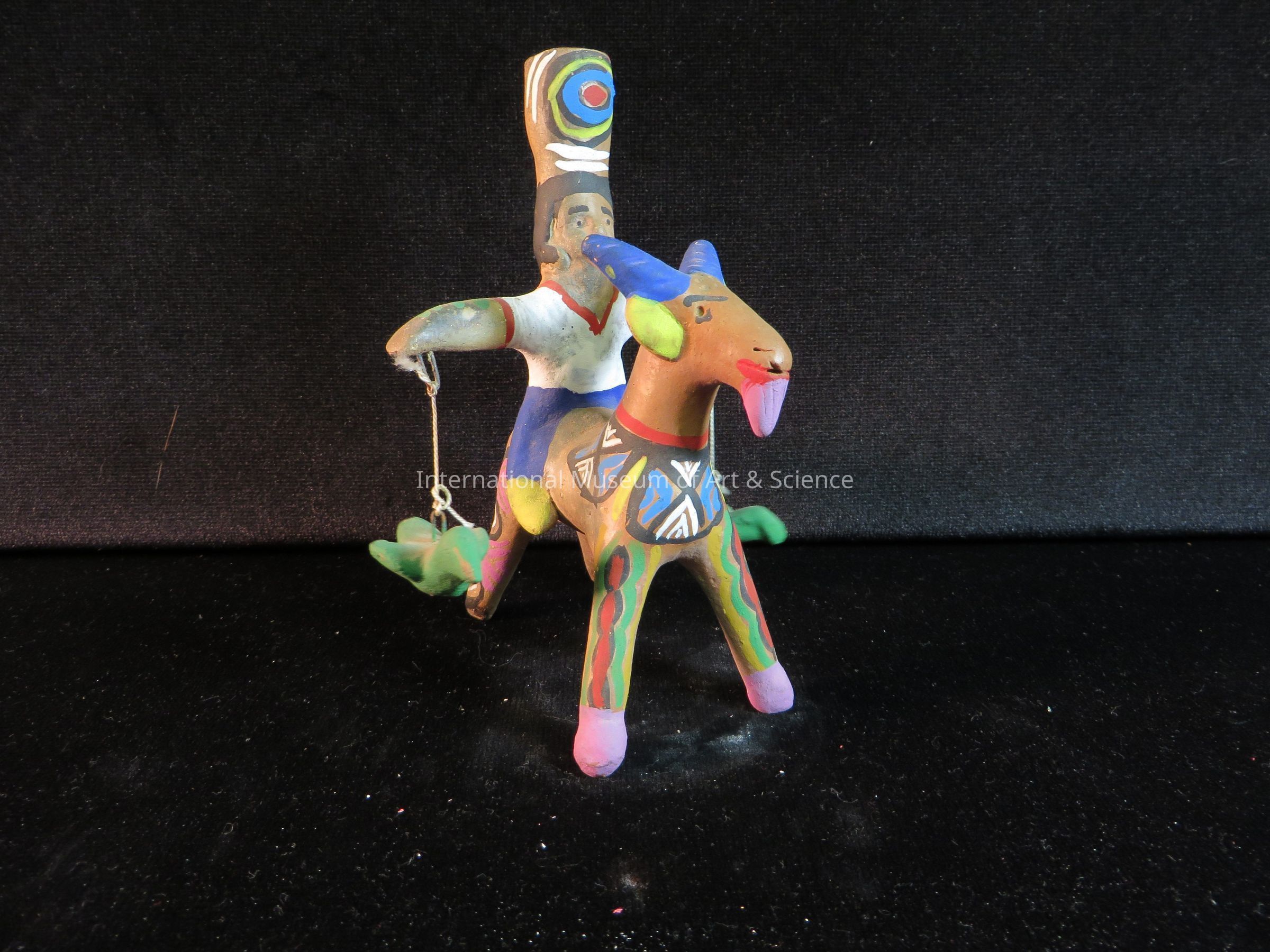 A clay figurine of a man riding a horse/goat with green birds hanging from extended arms. The man is also balancing a basket on his head. The horse is decorated in purple and yellow, red and green.Artwork Details