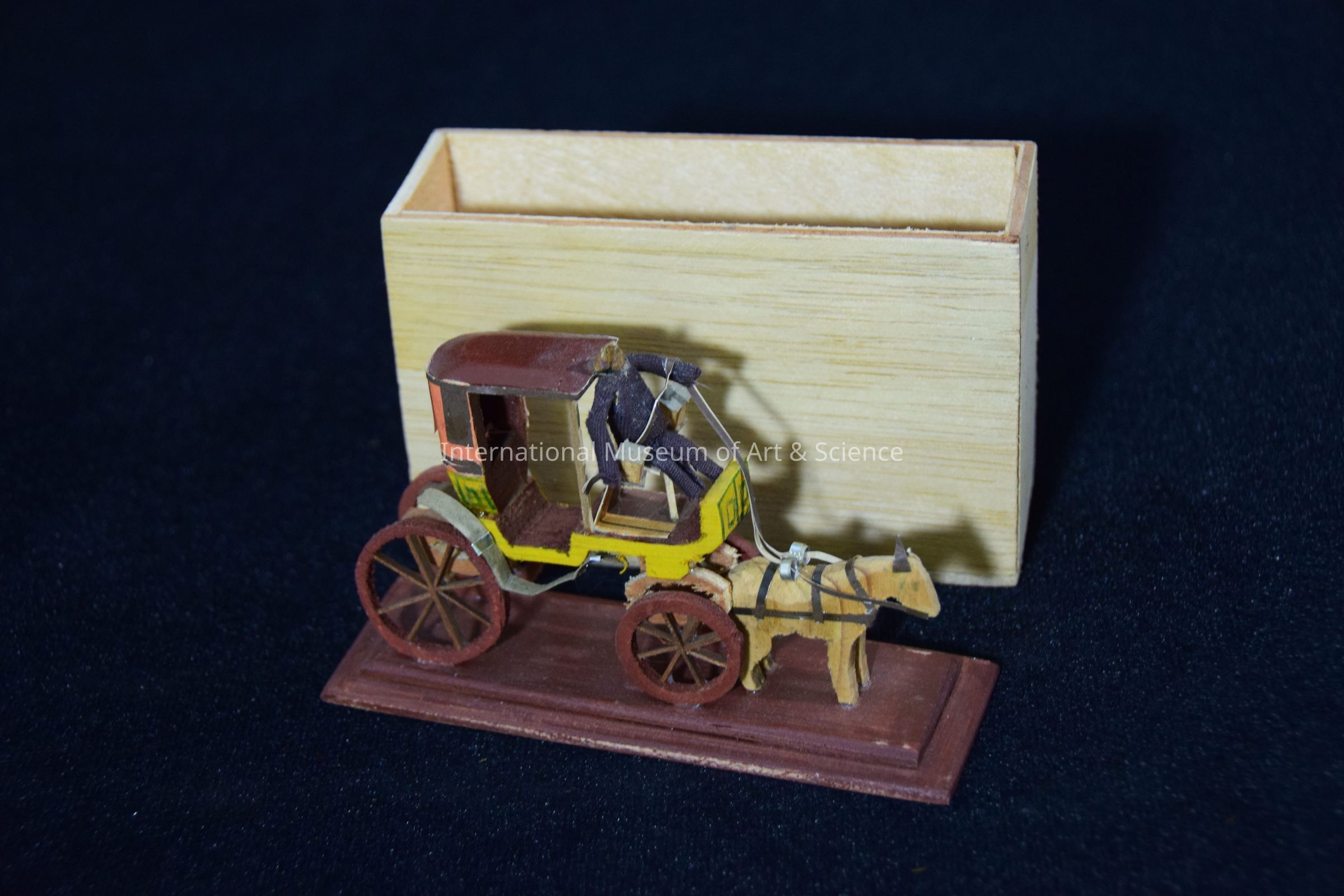 Horsedrawn Carriage Figure. Horse-drawn passenger carriage. Wooden carriage with wheels, stained brown. Sides of floor of carriage painted yellow. Back is painted yellow with green design on bottom section; top section painted orange with pieces of paper attached for decoration. Runners along sides of carriage made of paper, attached with metal. Drives seat made of paper adn wooden stick. Driver is wooden with brown cotton clothing and yellow paper hat. Wooden horse, natural color, with brown paper harness and ears. Eyes and part of harness drawn in green. Inverst to fit inside storage box.Artwork Details