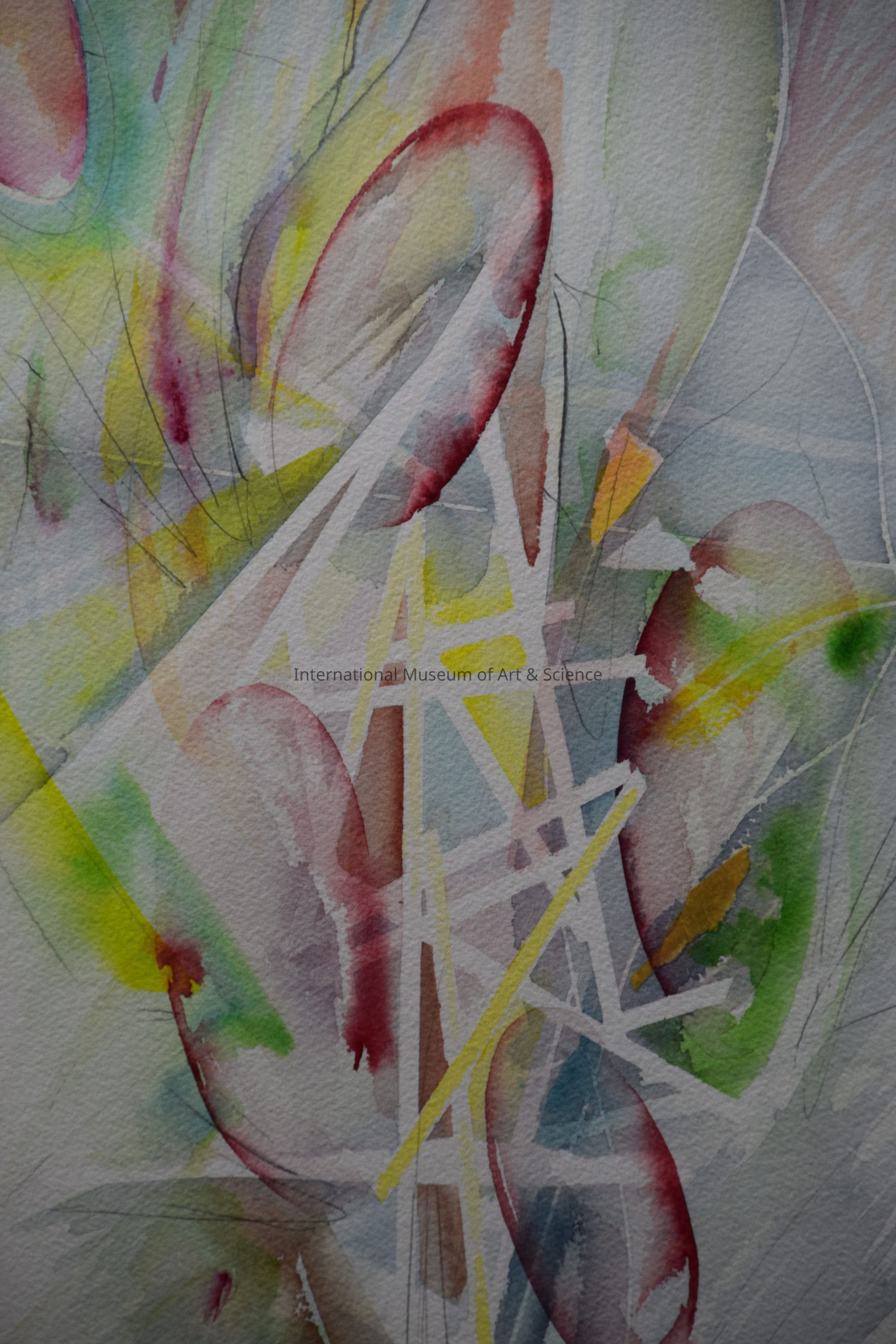 "How I Feel ABout the City of Paris" Houston, Texas. Arthur Turner. Watercolor, paper. Transparent hues of yellow, red, blue, pink, green in composition made up of abstract forms in vertical band filling center half of paper. Oval forms interjected by narrow white bands made by masking those areas. Approx. 4" to right of upper left corner is 4" x 6" pencil-drawn rectangle containing excerpt of Paris street map.Dimensions