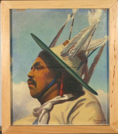 Painting of a man wearinf a colorful straw hat with feathers attached.