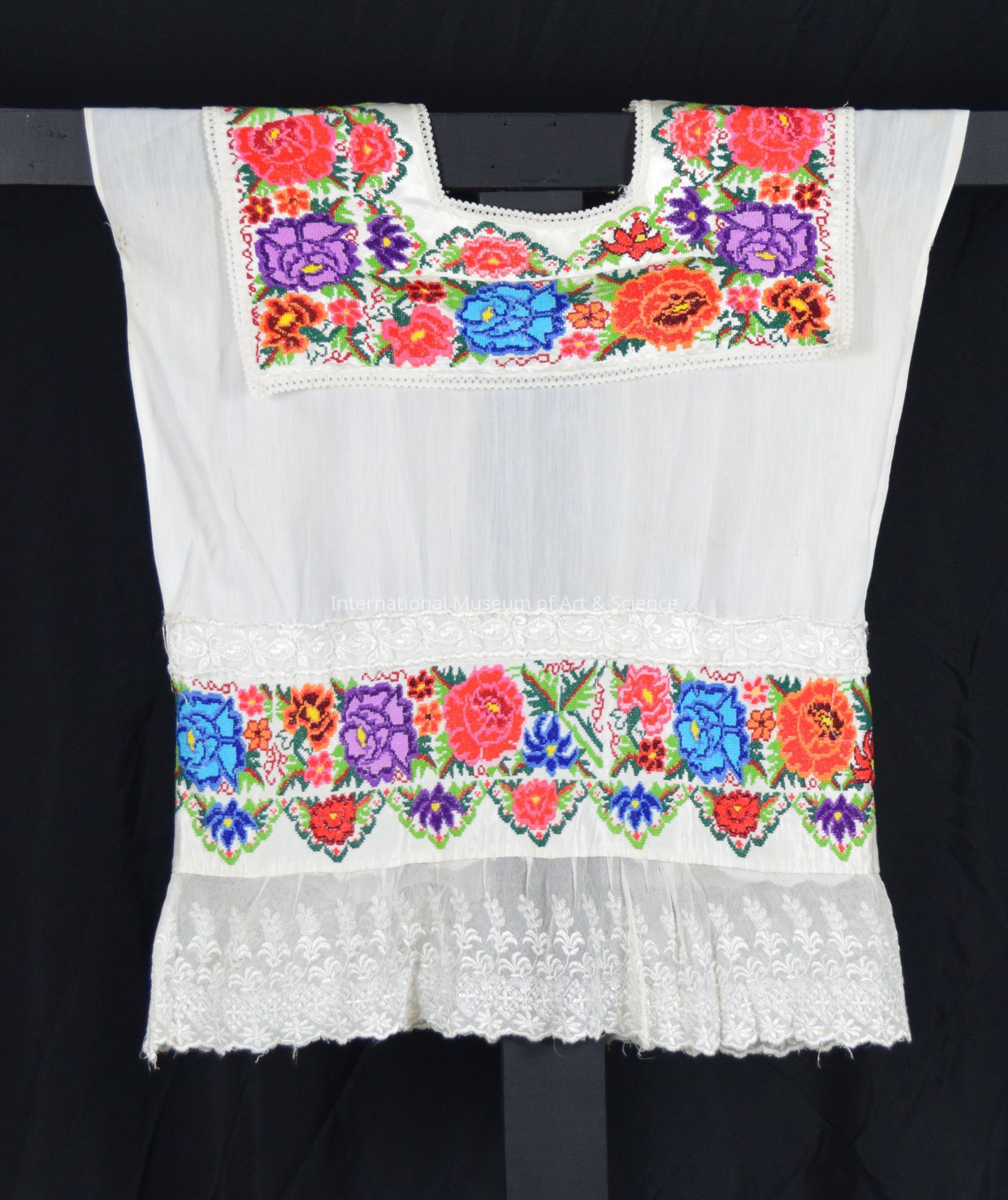 Hipil, long white sleeveless blouse with square colar in front and back. Collar is cross stitched in a multi-colored floral design; neck and edges of collar finished in white lace; multi-colored cross stitched floral pattern is repeated at the bottom of the huipil and finished with a 2" band at the bottom of the huipil. The bottom of the cross-stitched band is finished with a 57/8" wide band of floral design lace.Artwork Details