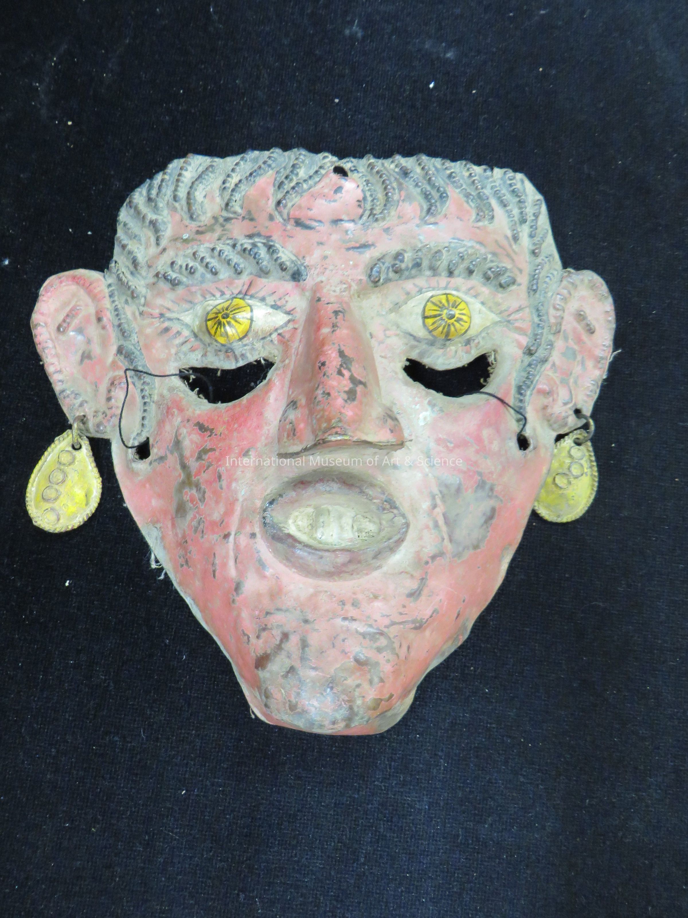 Human face panel. Elongated oval face mask, oval copper sheet bells in the ear lobes; cigarette in the mouth. Surface painted with pointed black "cowlick" hair and sideburns; heavy black brows; yellow eyes, sharp prominent nose, red oval mouth opened expost two teethArtwork Details