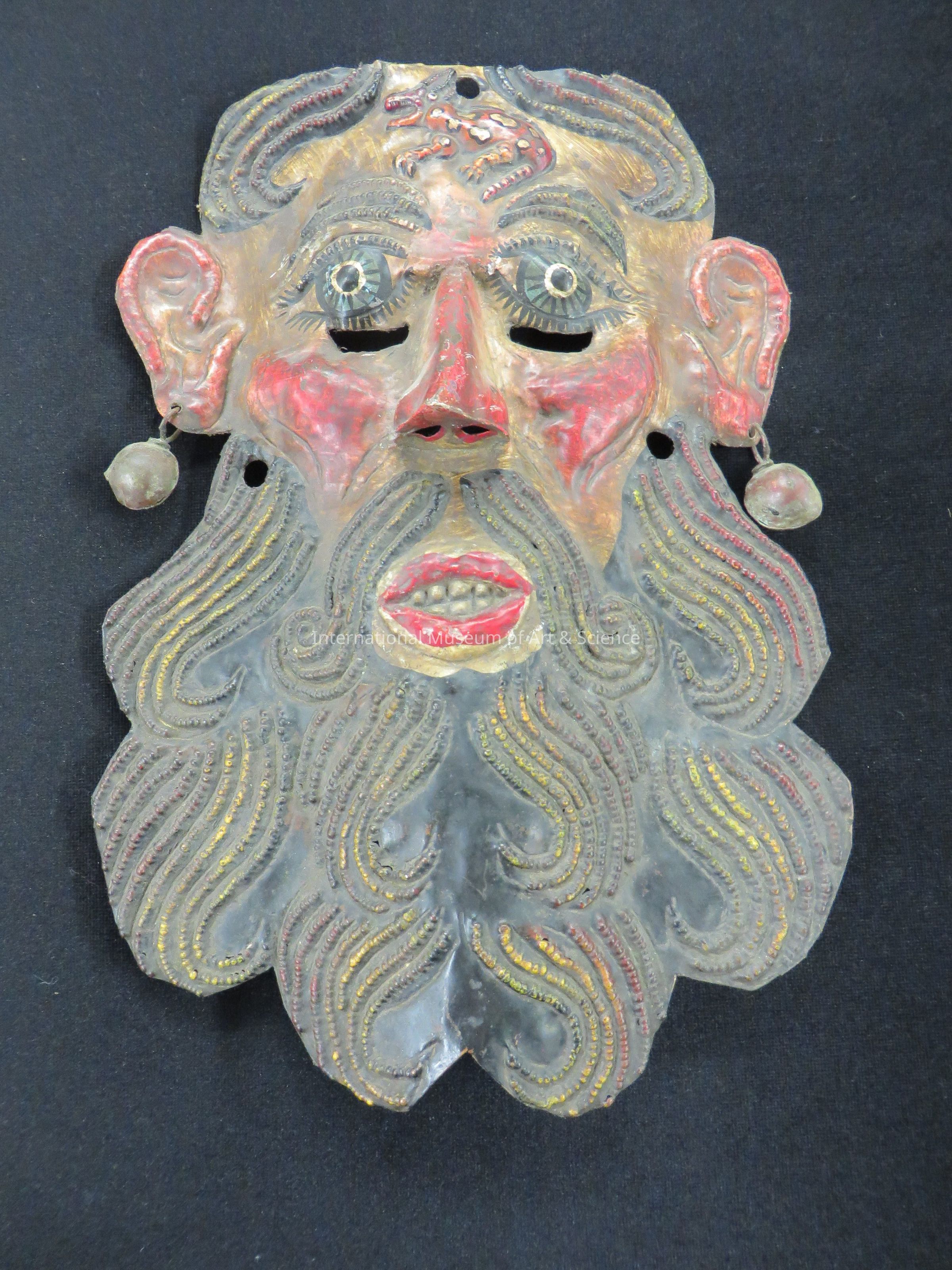 Human face panel. Squat hammered panel representing the Bearded man, dark green eyes, scalloped black beard, fox repoussed on the forehead. Heavy black brows, red face color, oval red mouth exposing teeth, large red ears, copper bells in the ear lobes, flat top, pointed black hair, long black curled mustache, prominenet red nose. small chin cup soldered on the backArtwork Details