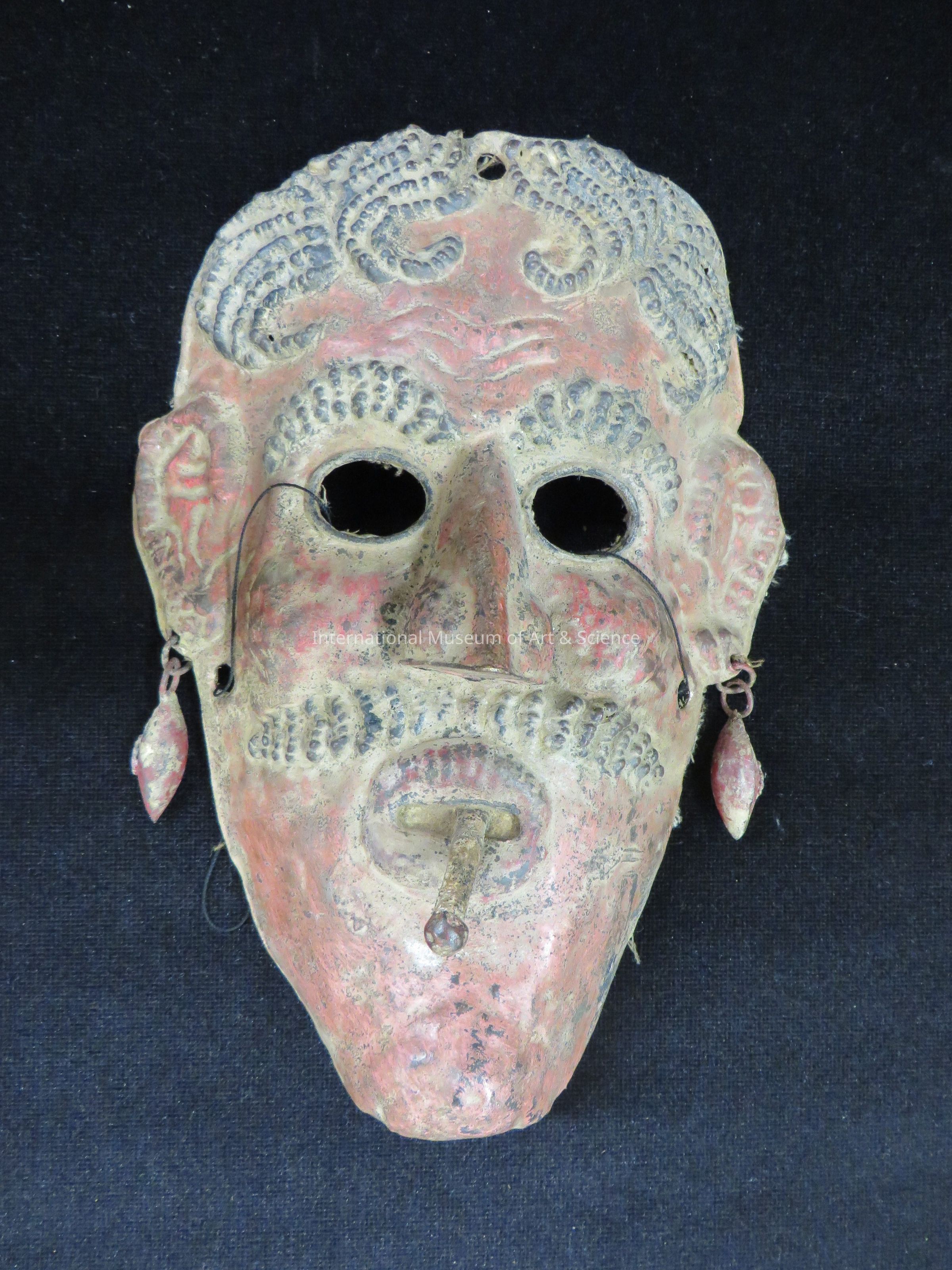 Human face panel. Elongated oval face mask, oval copper sheet bells in the ear lobes; cigarette in the mouth. Surface painted with pointed black "cowlick" hair, rounded top; heavy black brows and mustache, reddish face color, prominent noseArtwork Details