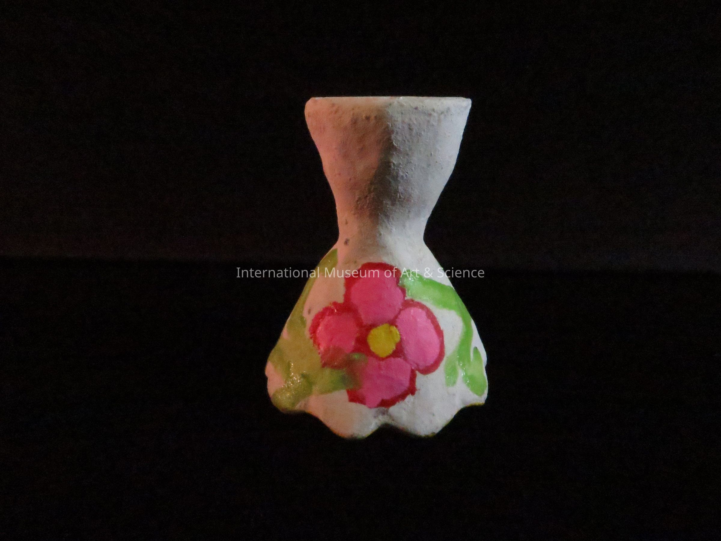 Incensario/Inscense Burner. Made of clay, painted white with pastel floral designs; flowers painted bright pink outlined in red with yellow; light green leaves on the concave mouth top with scalloped rim painted yellow; convex body plain white.Dimensions
