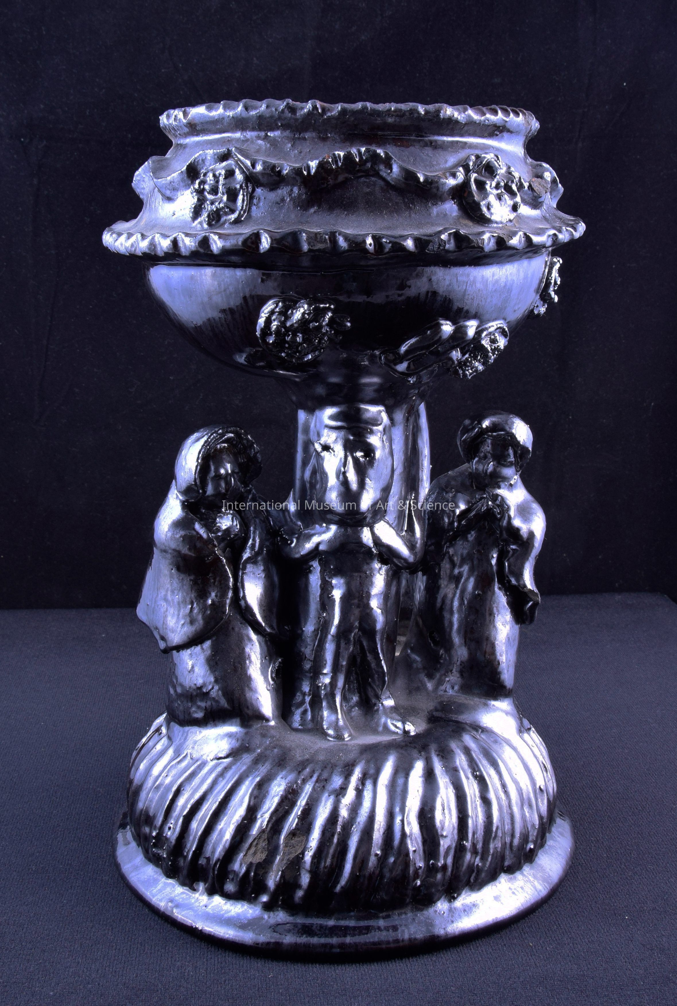 Incense burner. Tzintuzuntzan, Michoacan, Mexico. Natividad Pena ( Tarascan). Clay, glaze, slip. c. 1986. Large black incense burner; bowl form at top, convex base; scalloped border at mouth, floral designs on the body with groove edge; three standing figures, two are wearing capes with long gowns, third one stands against a pole, with a tub-like object behind him; wide curved handle; vertical curvilinear designs on base; overall black.
