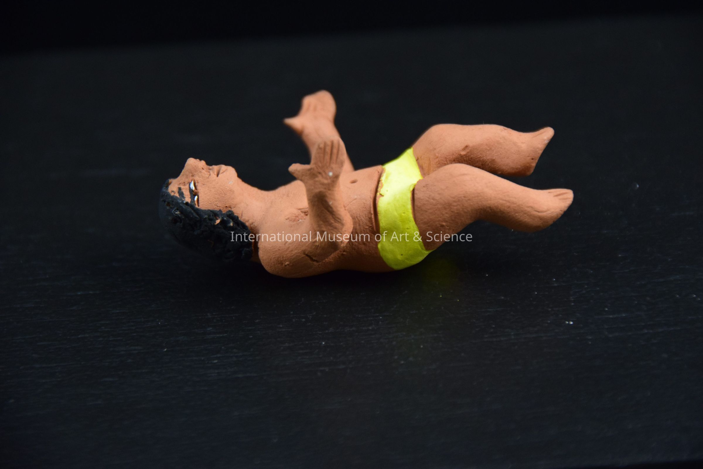 A cermic figurine of Infant Jesus. He is wearing yellow shorts. He is laying on his back. He is part of a 13 piece Nativity scene.Dimensions