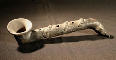 A black clay, ceramic wind instrument. The instrument looks to be a saxophone like instrument. There are 4 holes, 3 on the neck, and one at the top near the mouth hole. There is a large hole at the base, for sound to come out. There are 3 decorative rims to the neck.Dimensions