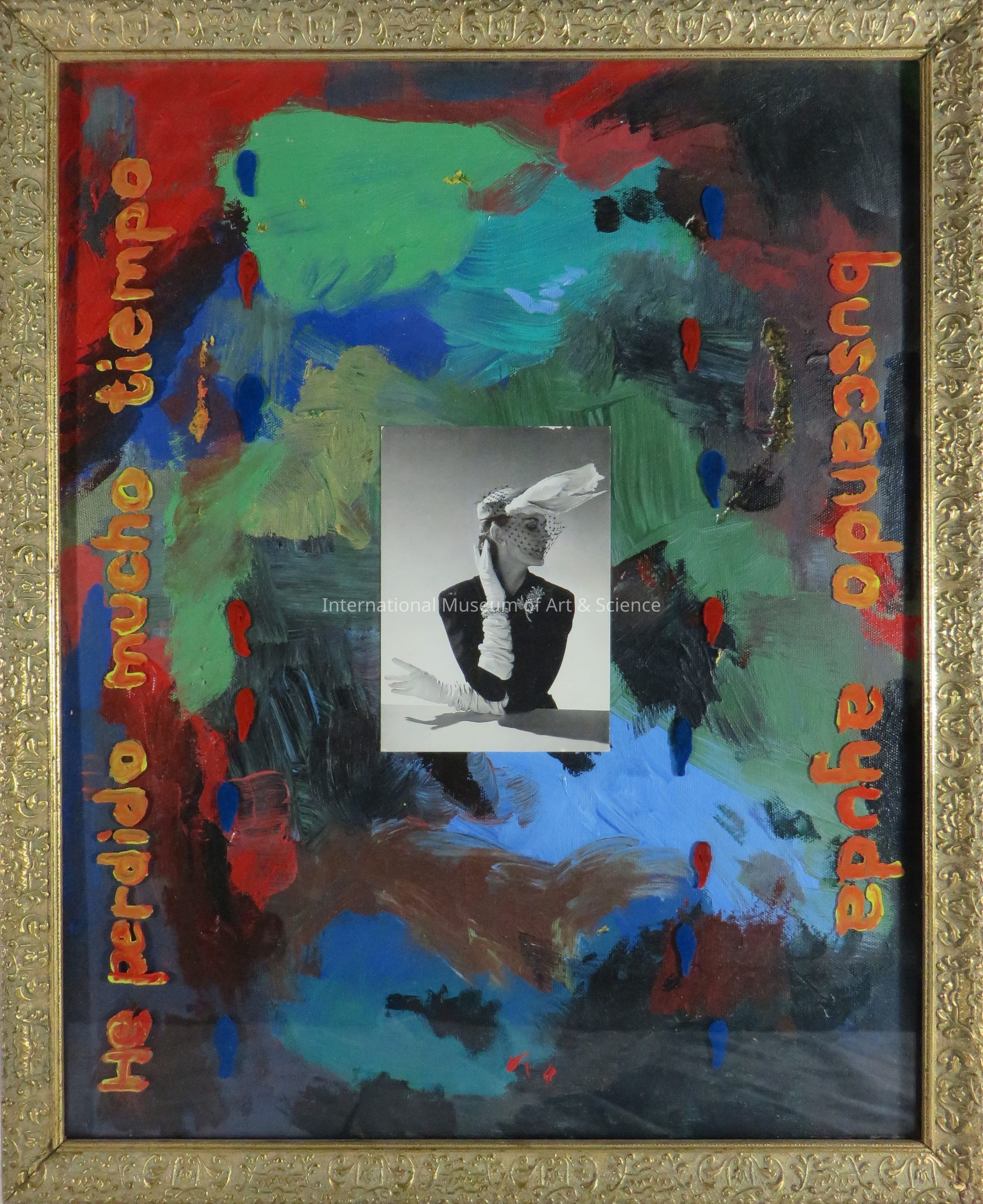 "I've Spent Too Much Time..." The assemblage shows a abstract painting with words around the edges and a photograph of a woman in the center.Artwork Details