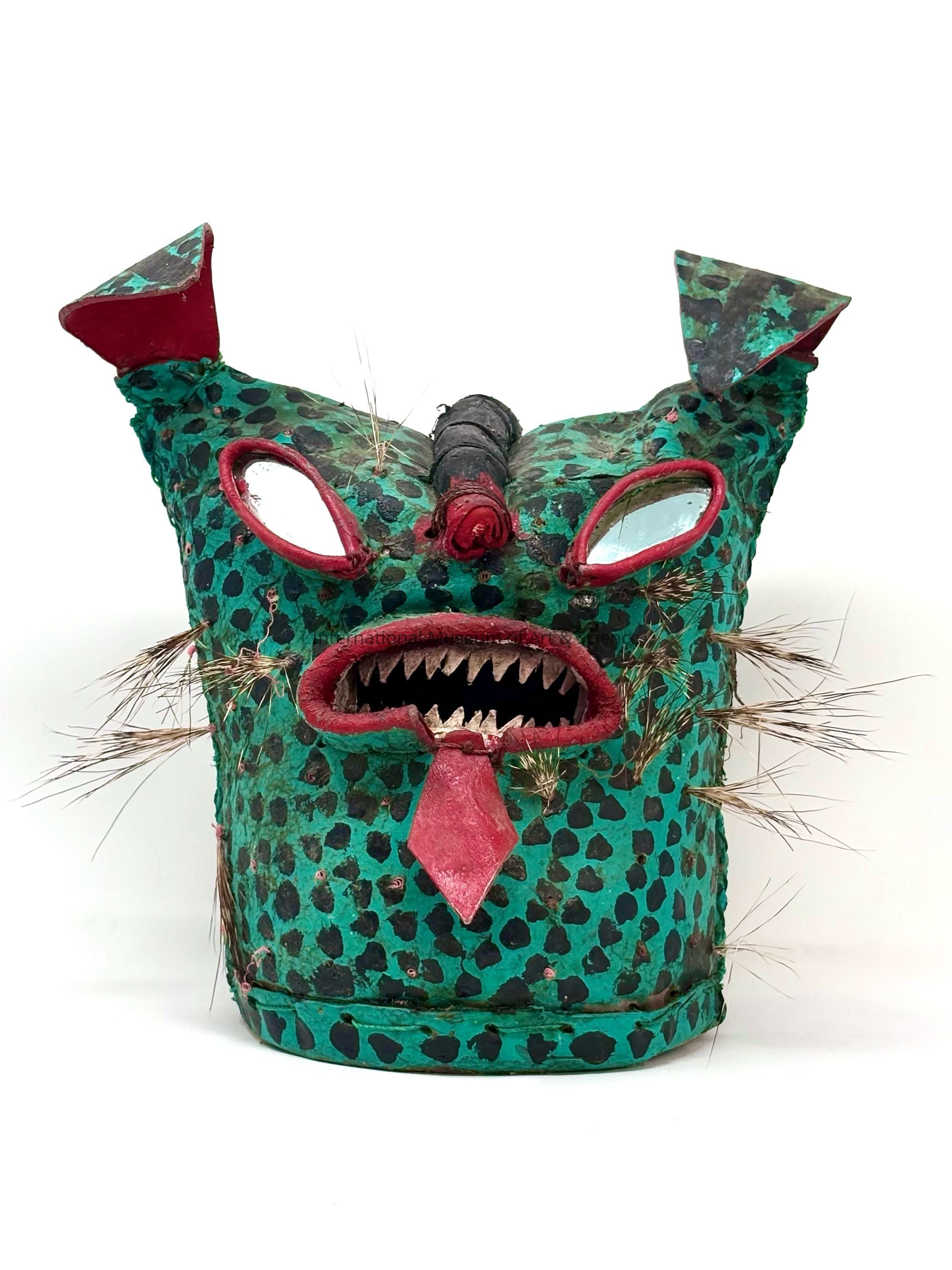 Molded and stitched tanned leather helmet formed into a cylindrical headpiece with a slightly flared lower edge. The surface is painted green with varying shapes and sizes of black spots to evoke a jaguar’s pelt, with visible wear and abrasions throughout. The front side features a face with a wide, open mouth outlined in red, exposing two rows of pointed triangular teeth and a projecting red tongue. Almond-shaped eyes with mirrored inserts are framed by raised red rims such as the mouth. A rolled leather component rises at the center of the forehead, with two angular, upright ears extend from the crown. Clusters of natural animal hair is inserted along the cheeks to simulate whiskers. The lower edge is reinforced with a stitched leather band.Dimensions