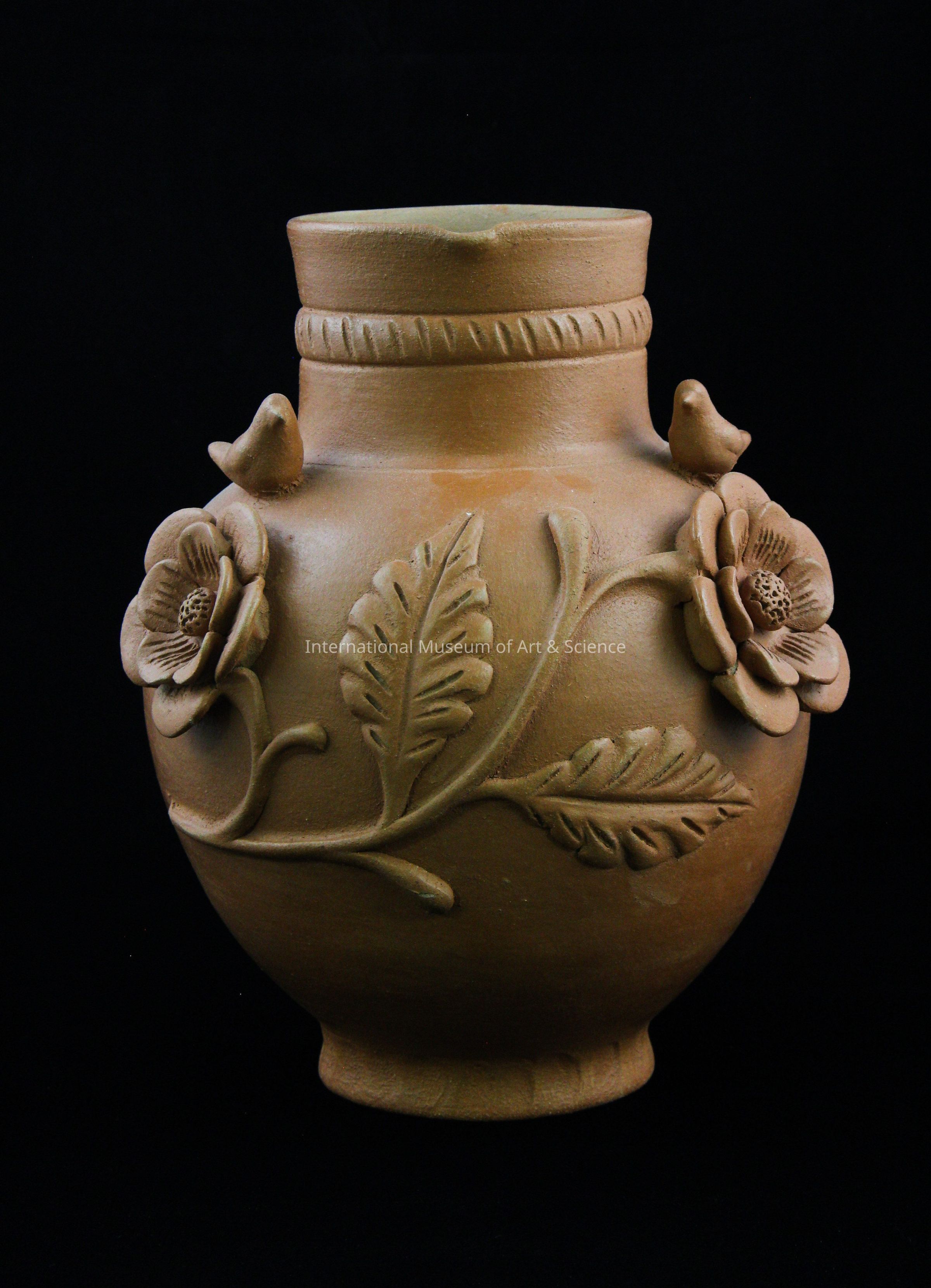 A red-orange clay pitcher with spherical body, short neck, round mouth with small lip for pouring; curved handle; body of pitcher has two small birds also in relief; neck, base and handle have clay indentions for decoration.Made/Created