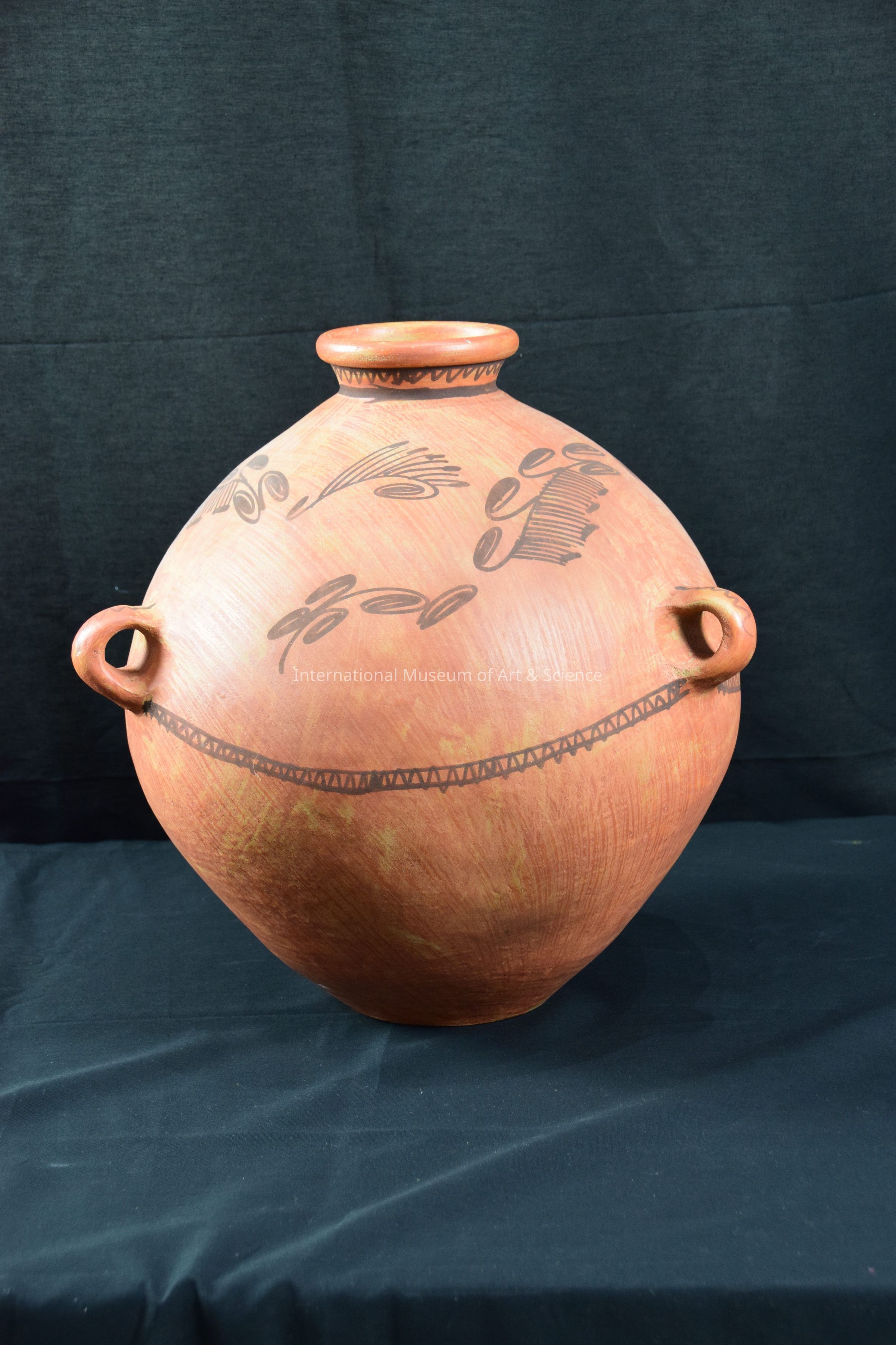 Large storage jar. Large jar w/global body; three open loop handles; round, open rim; brown geometric bands; brown floral motifs; orange ground.