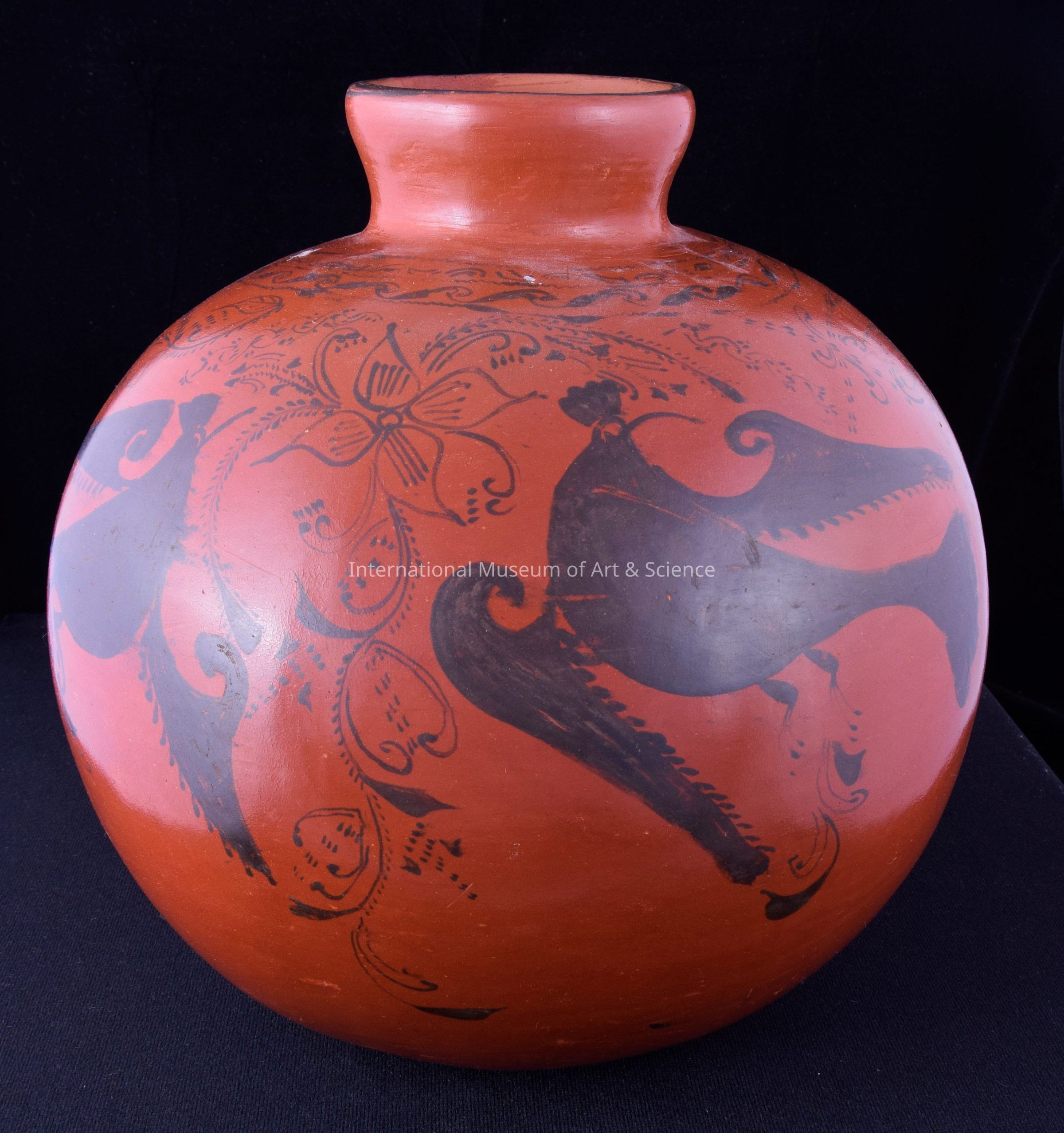 Stackable jugs. Patamban, Michoacan. Clay, paint. c. 1986. Red painted clay jug; three large, round with small neck; bird and floral designs in dark brown; vary in size, largest jug at bottom, smallest on top.Dimensions