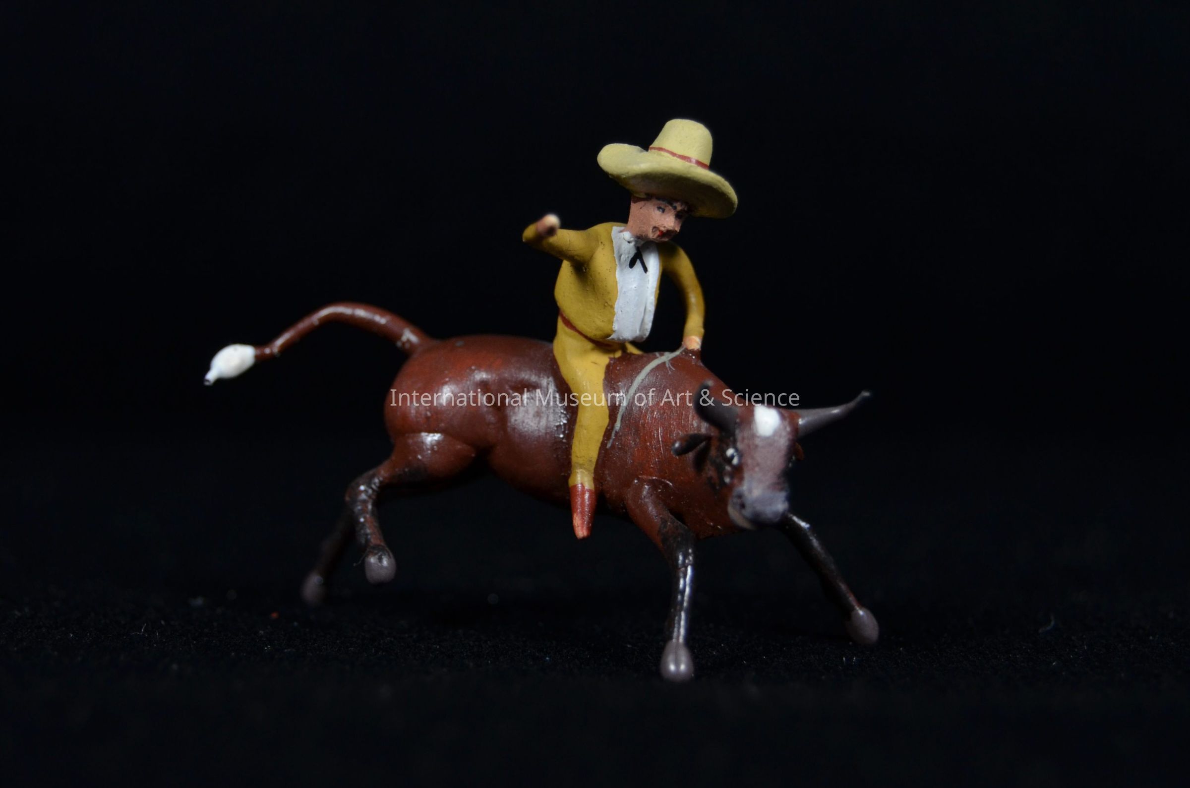 A miniature clay figurine. The figure is wearing a blue suit and sombrero. He is riding a brown bull with a white spot on its head and a white tail. The figure is part of a rodeo scene.Artwork Details