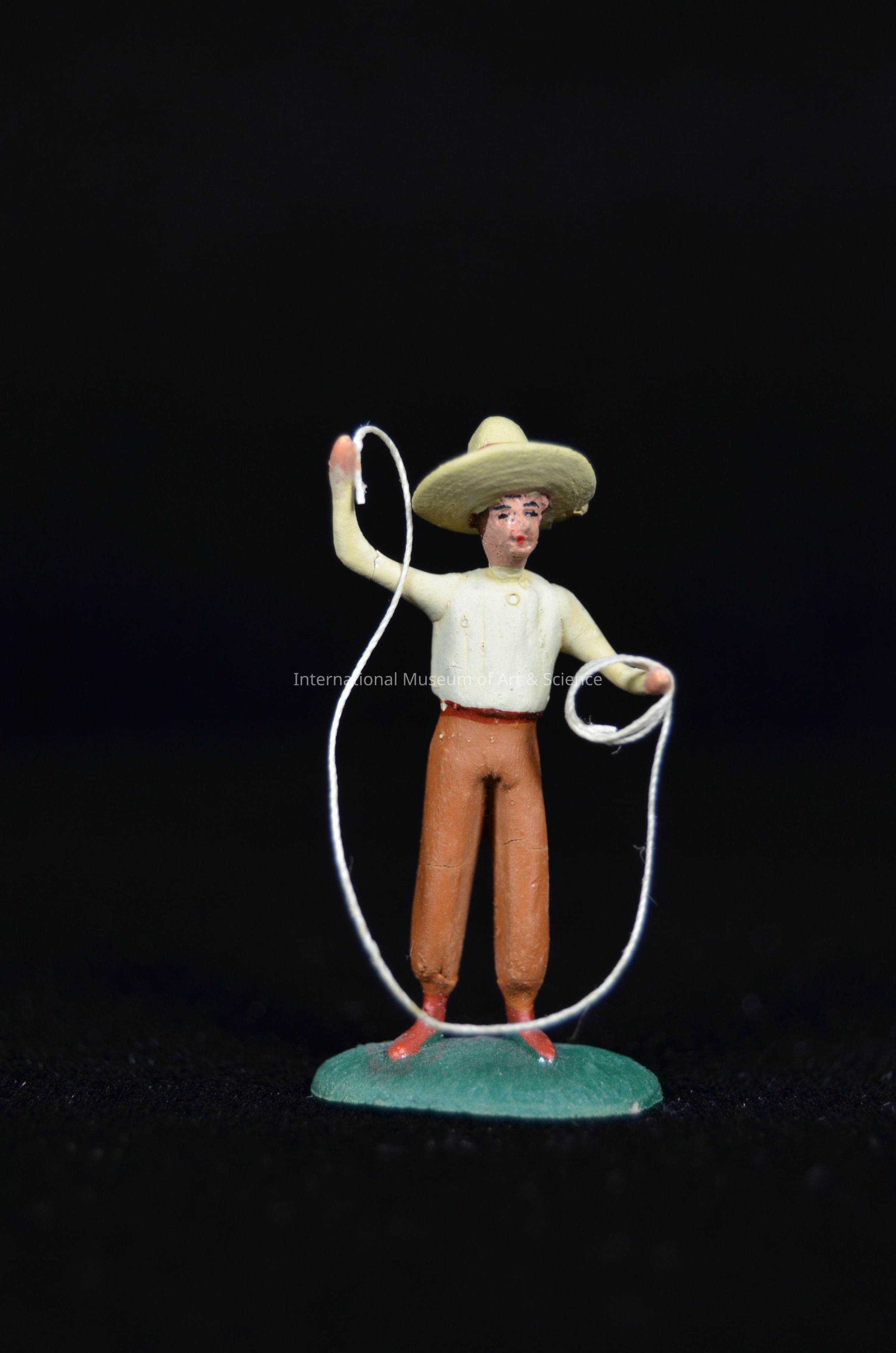 A miniature clay figurine. The figure is throwing a lasso. He is wearing brown pants, a light yellow shirt, and a sombrero. The figure is part of a rodeo scene.Artwork Details