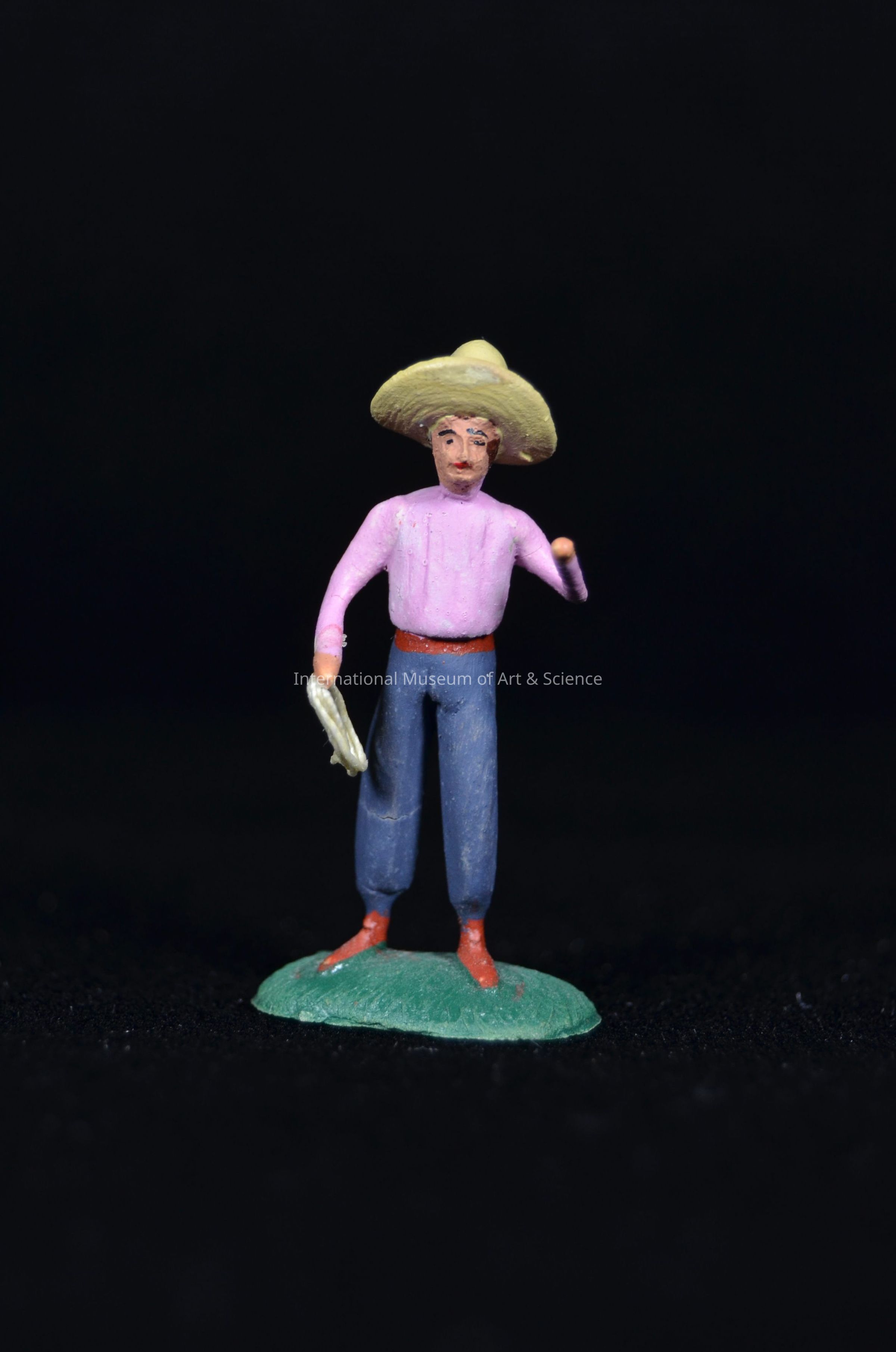 A miniature clay figurine. The figure is holding lasso, wearing pink shirt, blue pants, and a sombrero. The figure is part of a rodeo scene.Artwork Details