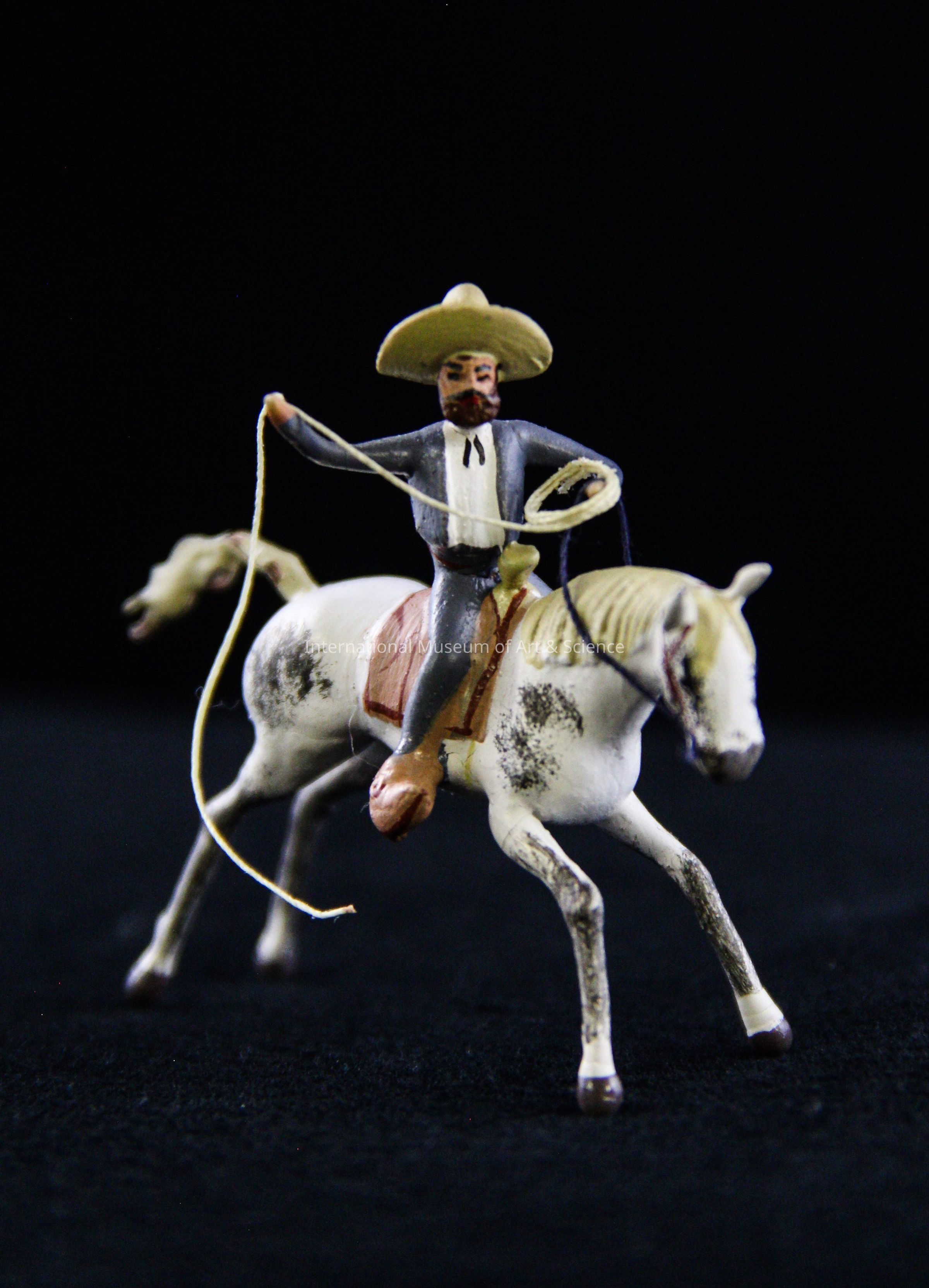 A miniature clay figurine. The figure is wearing a blue suit and sombrero. He is throwing a lasso while riding a white horse with a tan saddle. The figure is part of a rodeo scene.Artwork Details