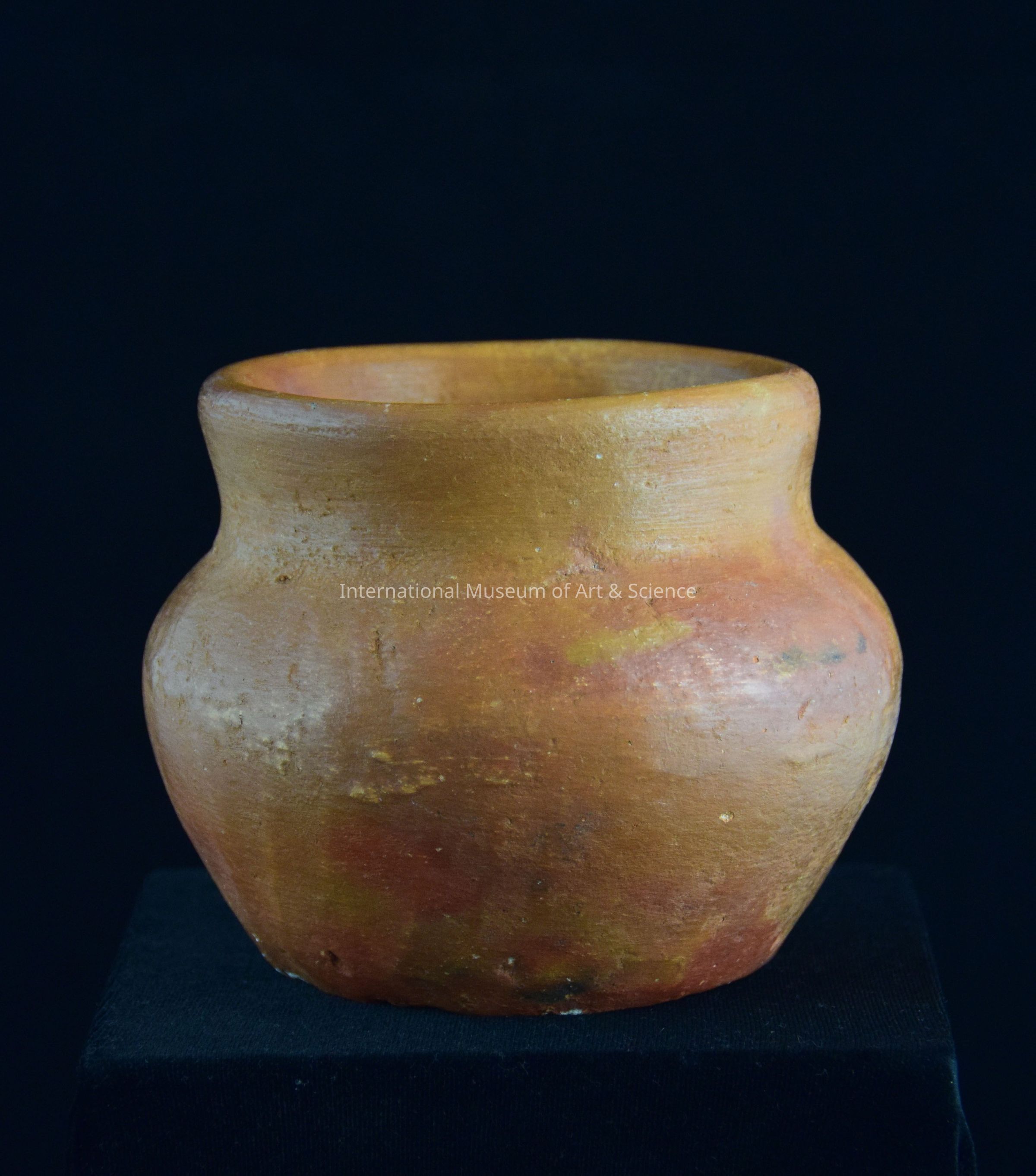 Small drinking vessel; over all red/orange; spherical body; short neck; round mouth; interior partially painted; base of interior unpainted and shows black fired spot.Made/Created