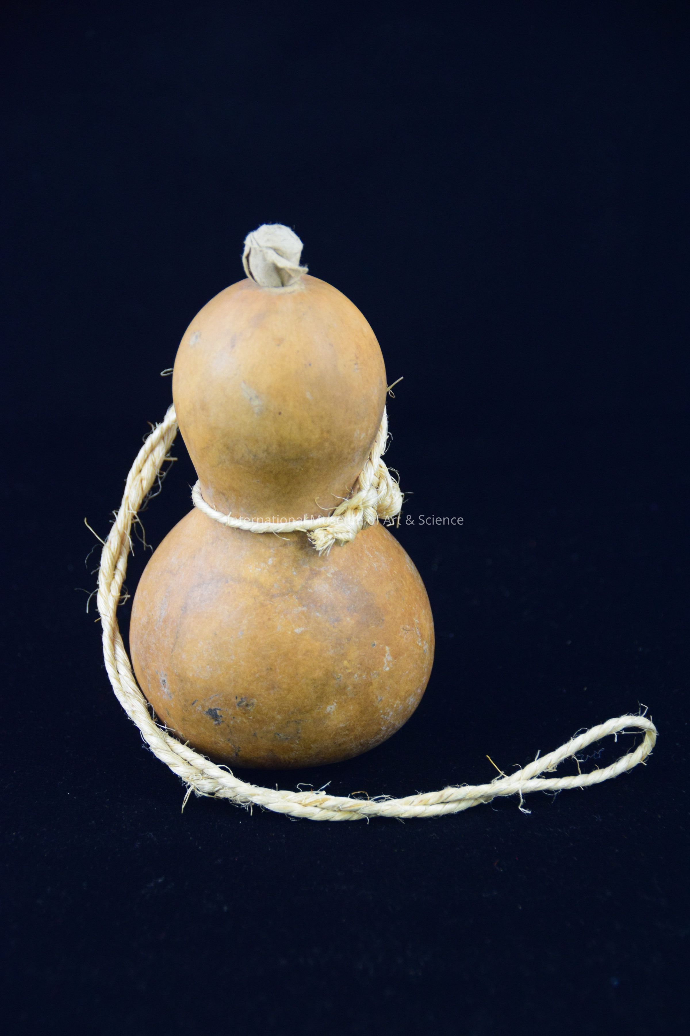 A gourd jug. The jug is made of natural gourd. There is an ixtle rope tied around the short neck for carrying. The jug has a small spherical head and larger spherical body, with a short neck in between. There is a hole carved on top and paper used as stopper is inserted.Artwork Details