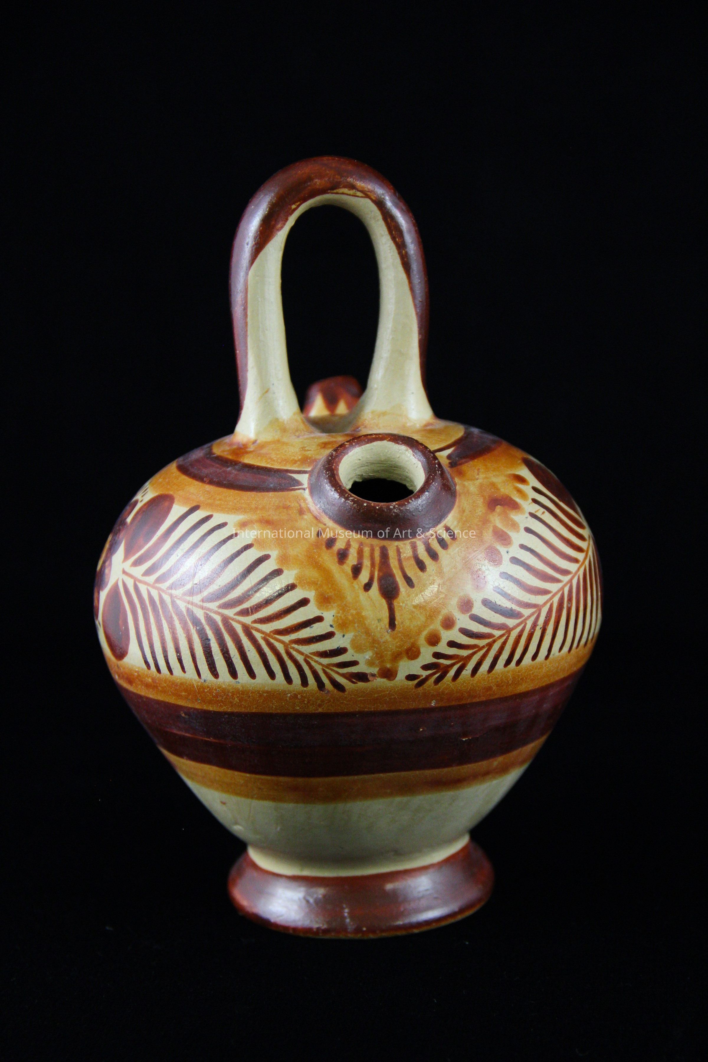 A jug with a large handle. The ceramic jug has two spouts. There is a high curved handle at center top. The spherical body has floral and leaf motifs in light and dark brown hues. The jug has a small round base.Dimensions