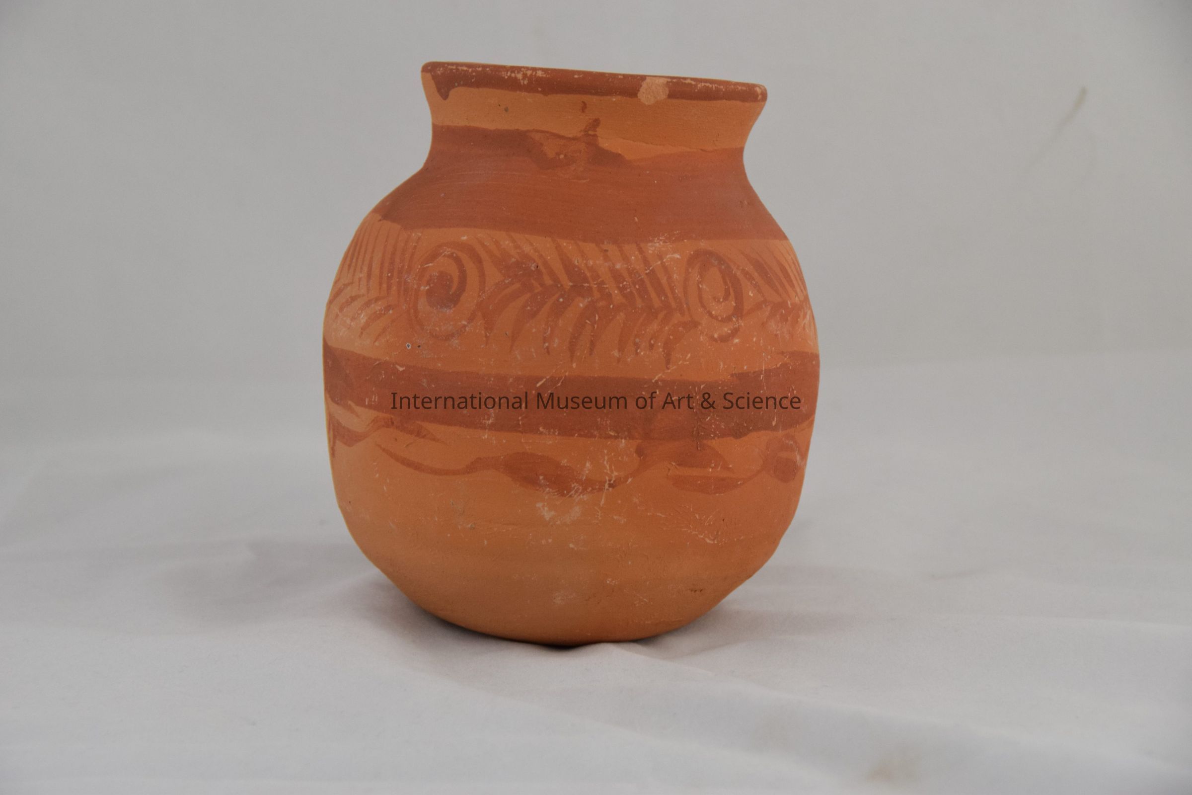 Natural Orange Clay Color; Spherical Body; red-orange Mouth Rim; Red-Orange Bands Followed by leaf and Circular Motifs.