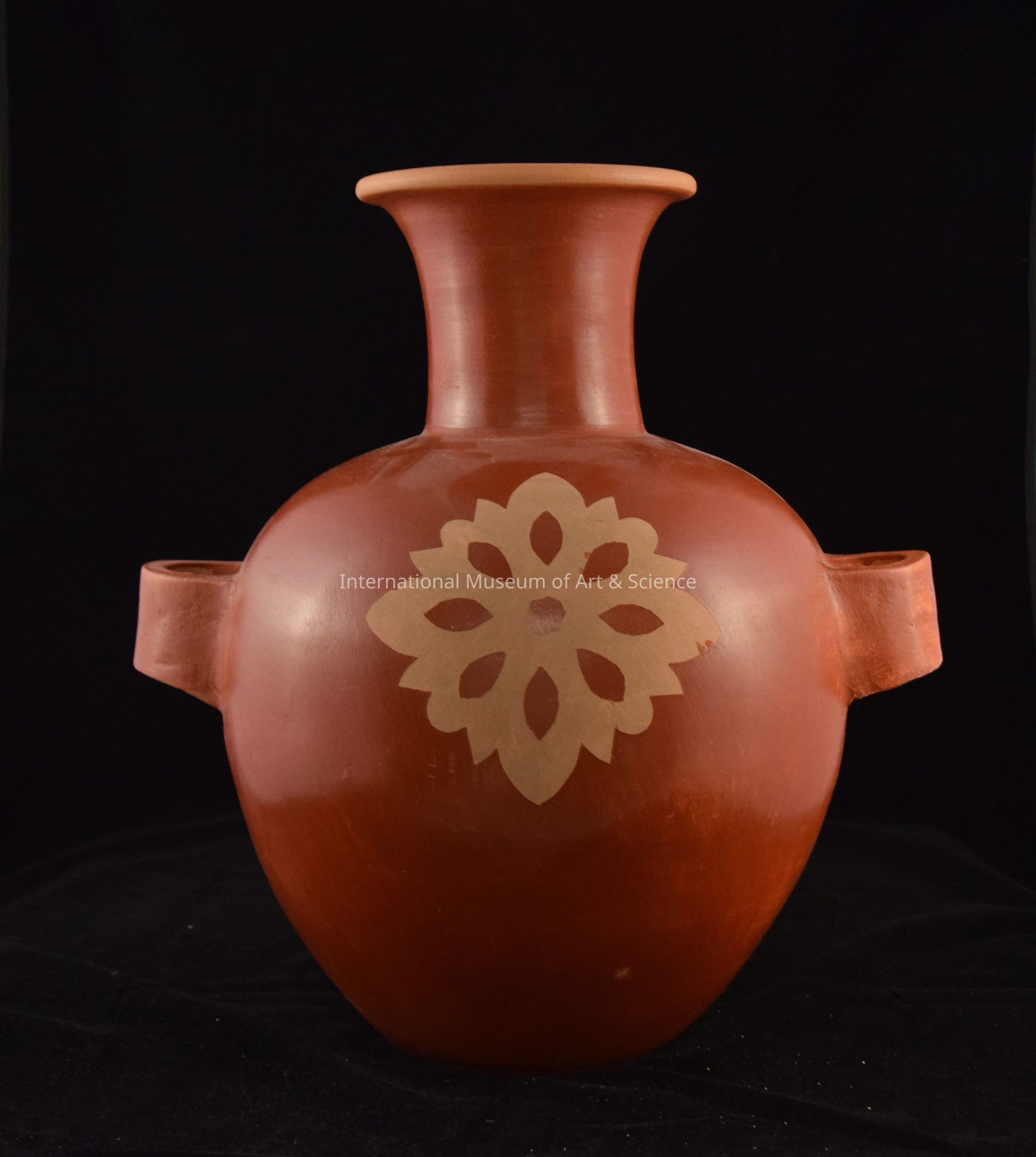 Jug with two handles (large tinaja); Ticul, Yucatan, Mexico. Miguel Antonio Tzum Uicab (Maya). Clay, carpet . c. 1987. Jug with large spherical body, long neck, large round mouth; two open looped handles projected on the sides; overall red-orange exterior; two pale hued floral designs on body; interiror natural color of clay, unpainted