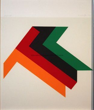 "July". Printed in Stuttgart, West Germany with design in form of "T" on diagonal; bands of color left to right are orange, red, black, and green; cream background; pointed corners.Dimensions