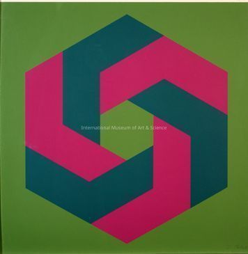 "June". Ingrid Pohl, German. Silkscreen. 1973. Printed in Stuttgart, West Germany with sextagonal shaped design; parrot-green background; sextagon in two interlaced colors of dark pine-green and magenta; background color in smaller sextagon form at center; 62/130.