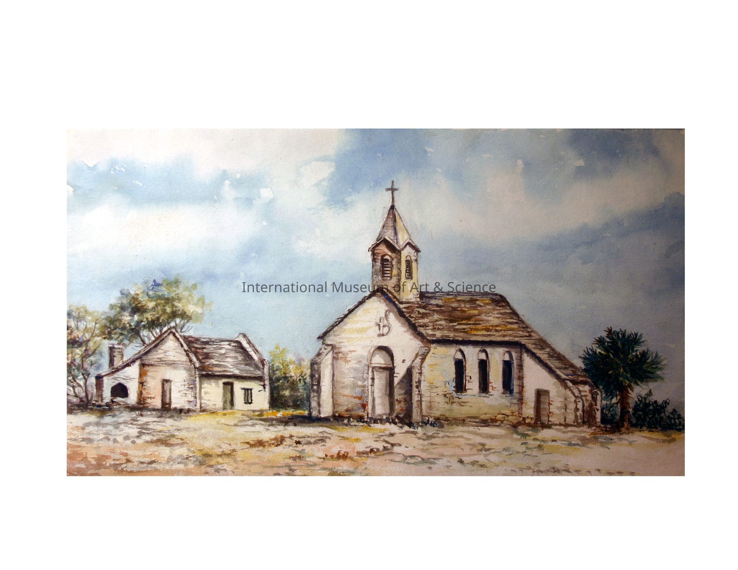 La Saenz: Church Building. Watercolor painting depicts two adobe buildings; church building with tower; a cross at the triangular tip; three arched windows on one side; arched door with a cross on top; smaller building on the side separated, small chimney; green trees, cloudy blue sky.Made/Created