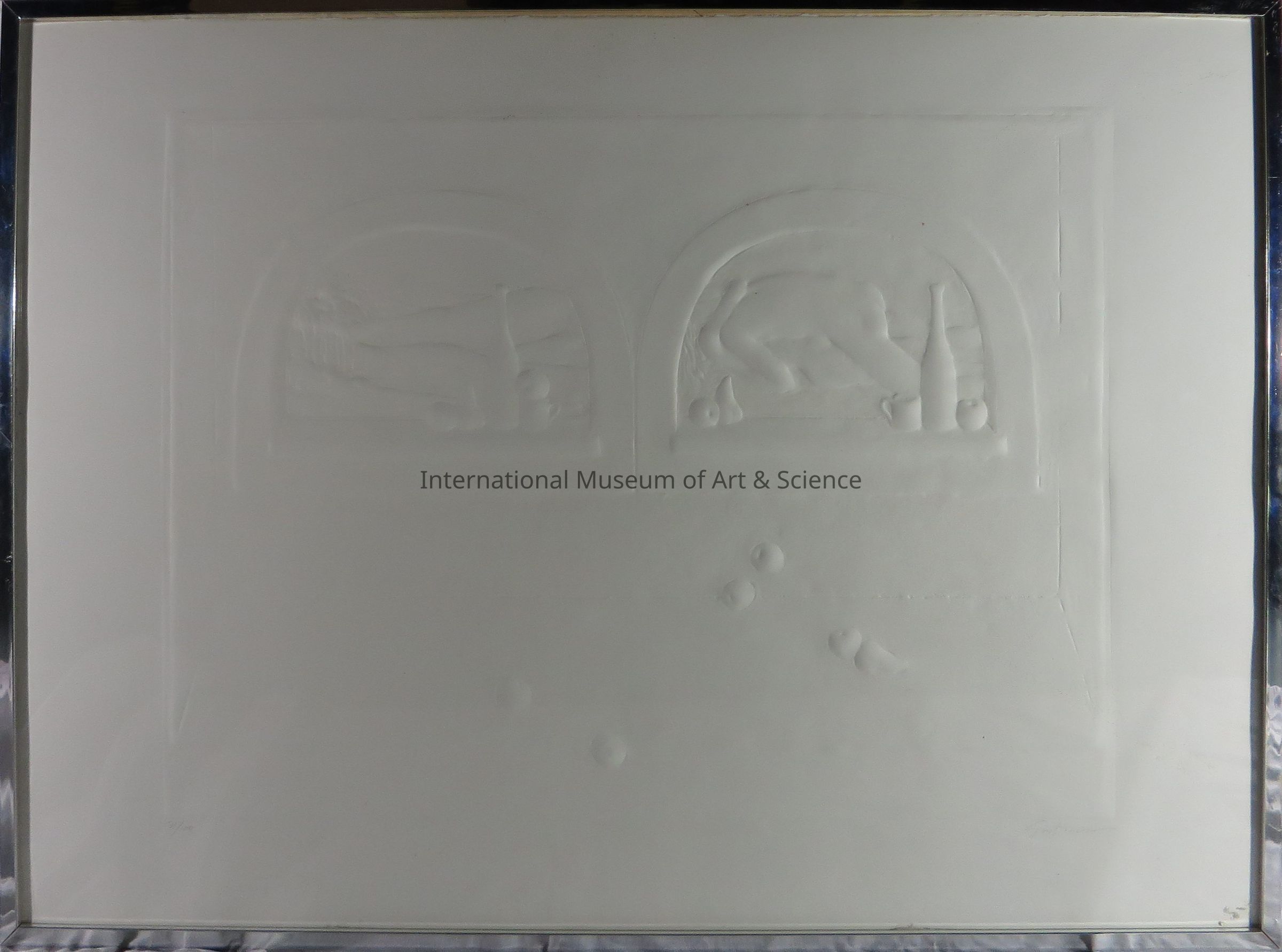 "La Terra Trema". Two arched windows and wall; window shows landscape of mountains and trees; window sill contains a bottle, cup, and three fruits in right corner of left window; right window looks onto two embracing figures reclining; wall outside shows fallen piece of fruit. 71/100.Dimensions