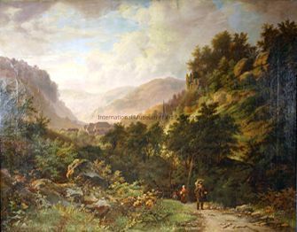 "Landscape-Austrian Alps". Valley scene with mountains in the background and people walking on the road.Artwork Details
