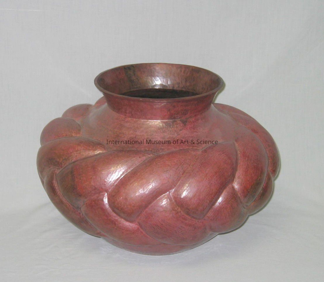 Large copper pot. Large copper pot; squat body form; large convex braided pattern; round concave mouth on top with concave base.Dimensions