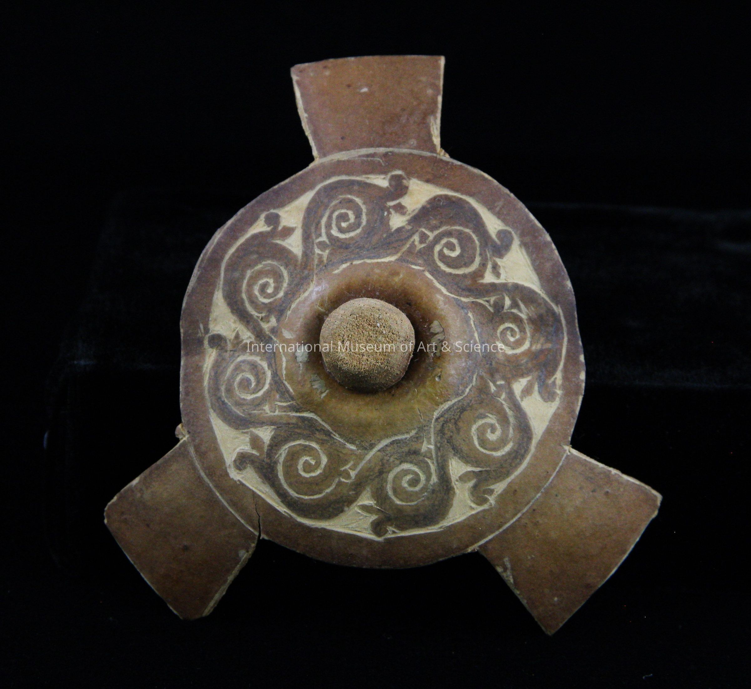 A lid carved with curvilinear designs. There is a round gourd handle at center top, and three projected gourd pieces that fit in place over gourd container.Dimensions