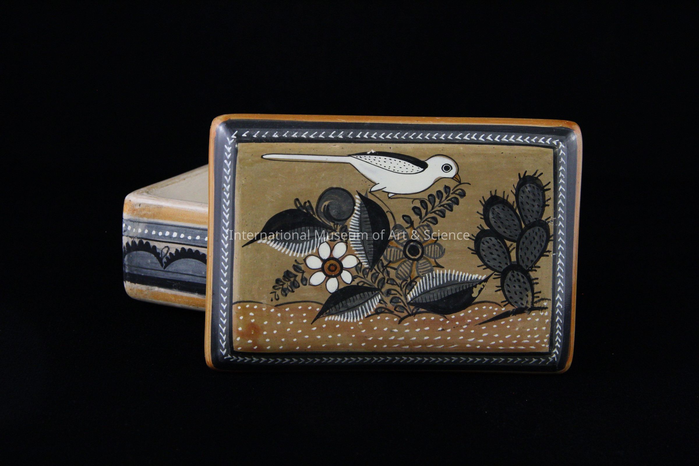 A ceramic lid to a trinket box. The rectangular lid has a red-orange border and background. There are black with gray side-bands that frame the center image. The center image is of a white and black bird over a cactus and other floral plants.Made/Created