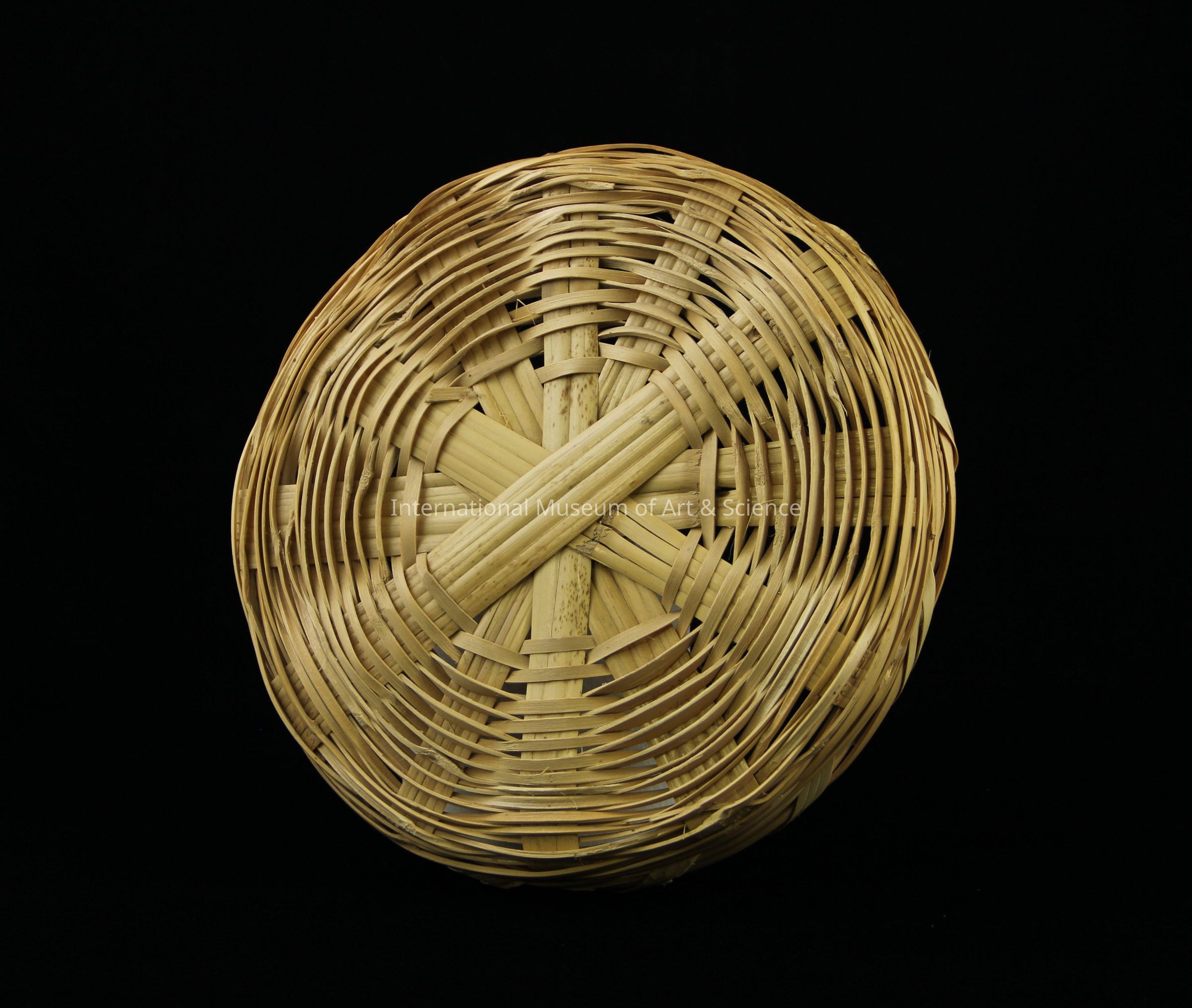 Basket with lid constructed of light, natural unfinished reed using a plaited weaving technique. The lid is constructed of 1/2 cm. reed woven around 3 cm. strips which are arranged dagonally. The plaited weaving technique is sepeated on the baskent bottom where the sides are constructed of 1/2 cm tula woven horizonally around vertical elements ranging in size from 2.0 to 3.5 cm. two 3 cm. bands wun horizontally around the bottom half of the basket.Artwork Details