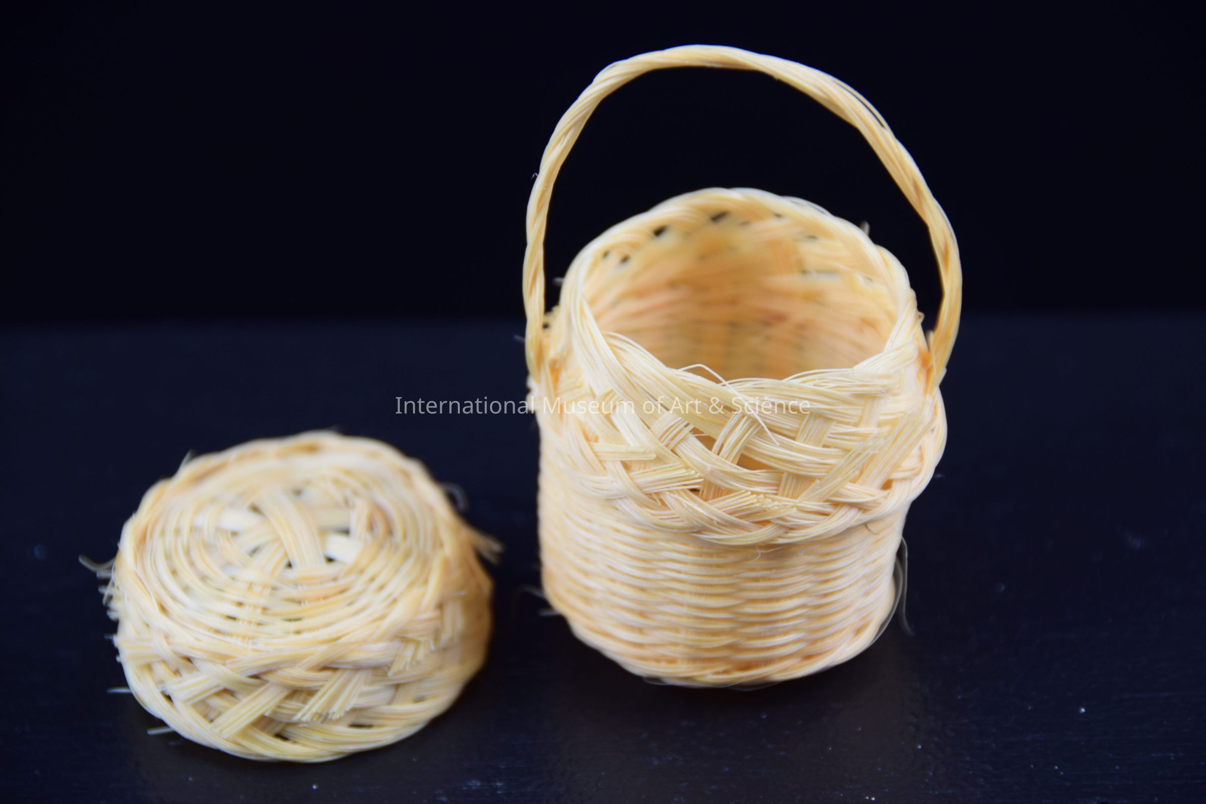 A miniature size basket lid, woven from ixtle. The basket lid has a decoratively woven top edge.